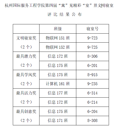 据悉,学院自开学初启动“文明寝室”创建以来,同学们以“文明寝室”创建为契机,彼此之间相互交流、相互合作,寝室氛围其乐融融。本次“文明寝室”创建历时两个多月,在杭州国际服务工程学院第四届“寓”见精彩室界文明寝室大赛中,共有10个寝室荣获研 “文明寝室”和“特色寝室”称号。