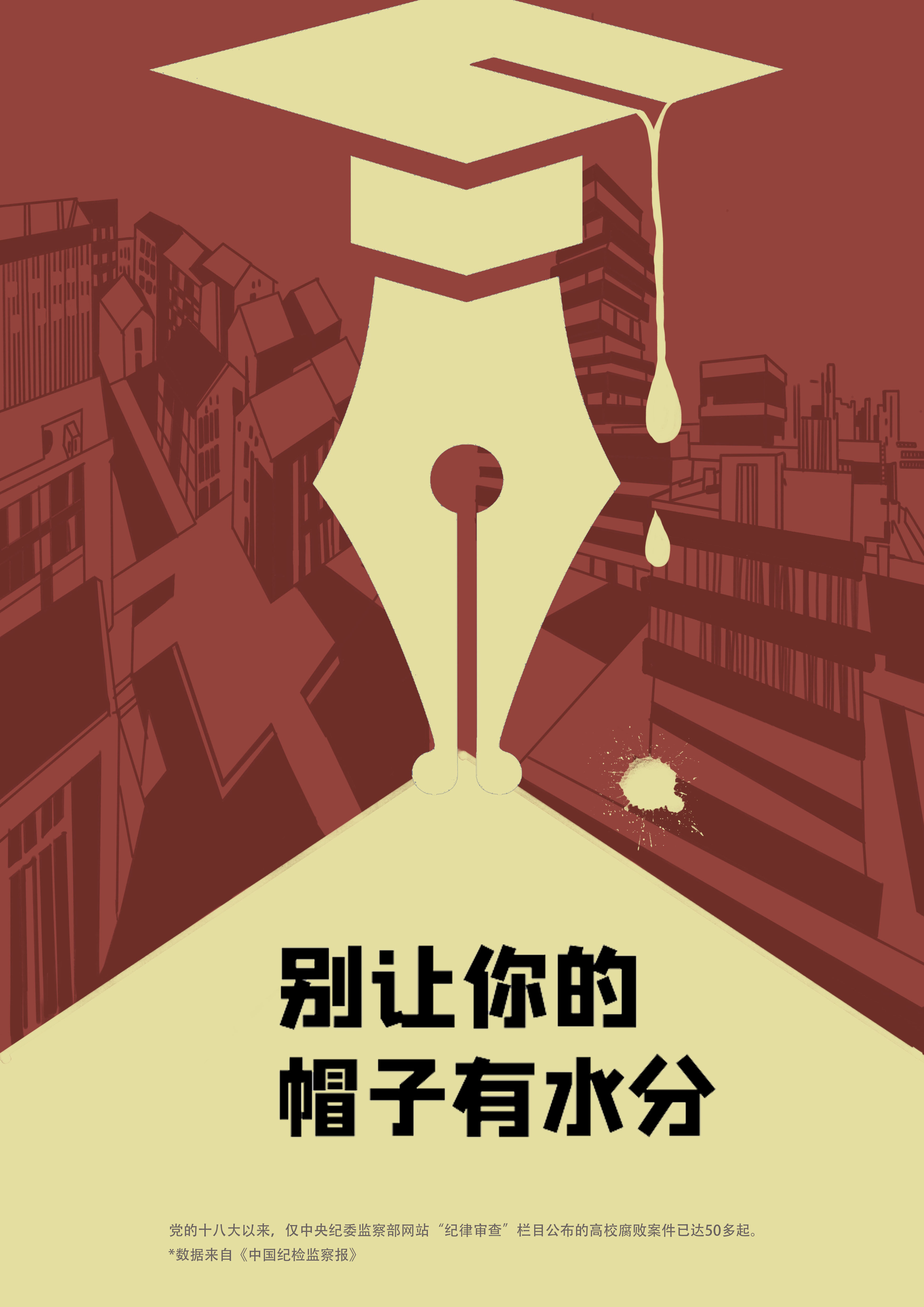 本次比赛共有近30余名同学参加,经过初选后,有17件作品入围校园114党员服务中心微信公众平台进行的线上投票。截止11月21日晚上,累计参与投票人数5623人,其中,获票数最高的为信工192班的谭雅丹、薛怡然及信工193班陈志豪的作品,得票均为2400票。在最后的讲解环节中,胡张可、蔡锦英的作品得到最高分,加上前期网络投票排名第四,最终荣获本次比赛一等奖。这张名为“别让你的帽子有水分”的作品,选取杭师大校园、学位帽、钢笔、水滴作为主要元素,将博士帽与钢笔巧妙结合,并与水滴呼应,讽刺了学术腐败现象在高校频发的现象,警示高校师生弘扬科学精神,坚守科学道德,维护科学学风。