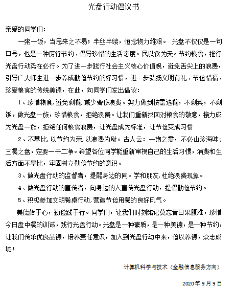 “一粥一饭,当思来之不易;半丝半缕,恒念物力维艰。光盘不仅仅是一句口号,也是一种厉行节约、倡导珍惜的生活态度。民以食为天。节约粮食,推行光盘行动势在必行。为了进一步践行社会主义核心价值观,避免舌尖上的浪费,引导人民群众进一步养成勤俭节约的好习惯,进一步弘扬文明有礼、节俭惜福、珍爱粮食的传统美德,在班会时向同学们发出倡议,大家一起签订一个光盘行动倡议书,积极践行光盘行动。”