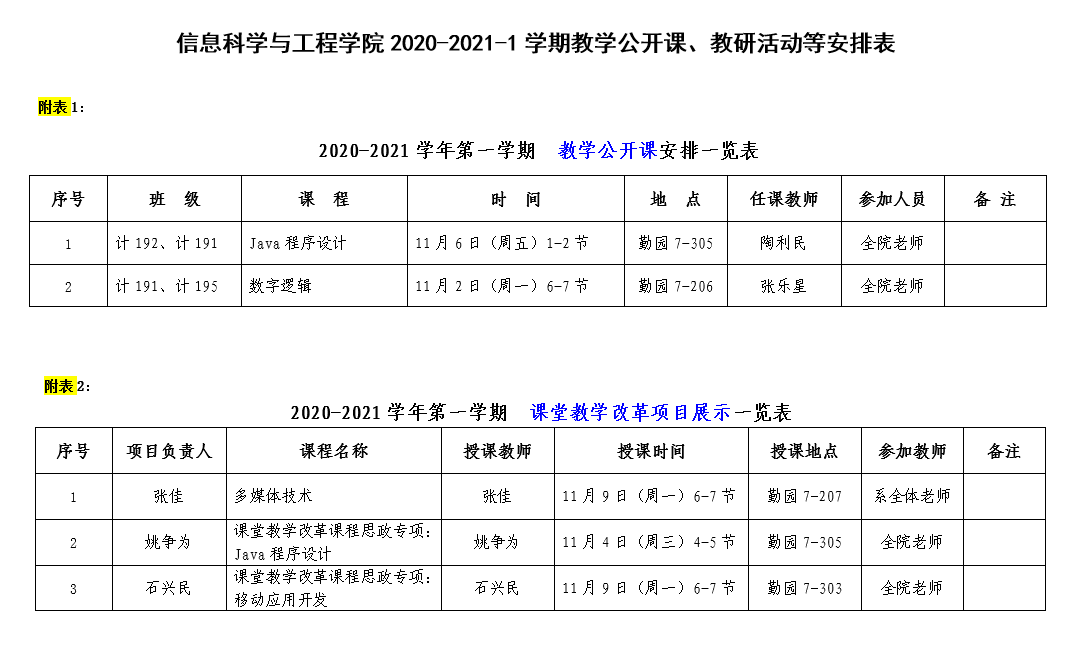 附件:信息科学与工程学院2020-2021-1学期教学公开课、教研活动等安排表