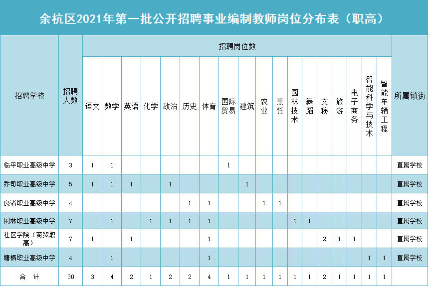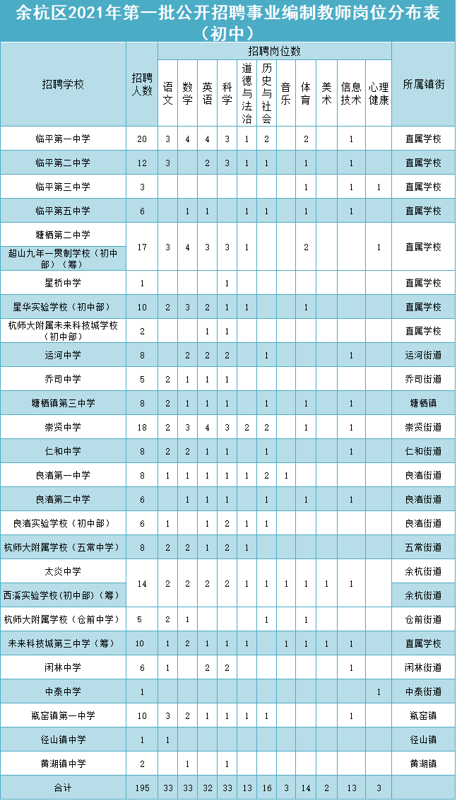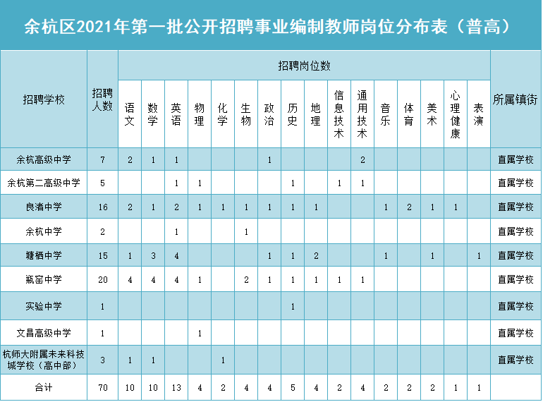 2021年第一批公开招聘中小学、幼儿园事业编制教师共700人,其中普高70人,职高30人,初中195人,小学355人,幼儿园50人。具体岗位招聘计划详见附件《余杭区2021年第一批公开招聘事业编制教师岗位分布表》。