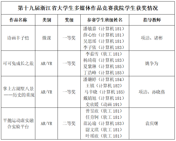 2020年再传捷报,文轩探花 学生在第十九届浙江省大学生多媒体作品竞赛中斩获3金1银 时间:2020-12-29 09:09:36 文章来源 :学工 浏览量:216 2020年12月19日第十九届浙江省大学生多媒体作品竞赛决赛在线上如火如荼地开展,文轩探花 4队学生在全省1119件作品中脱颖而出,斩获3金1银,创历史新高。浙江省大学生多媒体作品竞赛是浙江省教育厅认定的一类赛事,旨在培养大学生的计算机多媒体设计与制作水平;培养大学生的创新意识和能力,引导大学生有效应用多媒体技术服务社会。办赛十多年来参赛院校和学生作品数量逐年增长,获奖率在近年却始终维持在36%左右。文轩探花 学生不畏艰难,勇攀高峰,在2020年收关之际给学院竞赛交上了一份圆满的答卷。