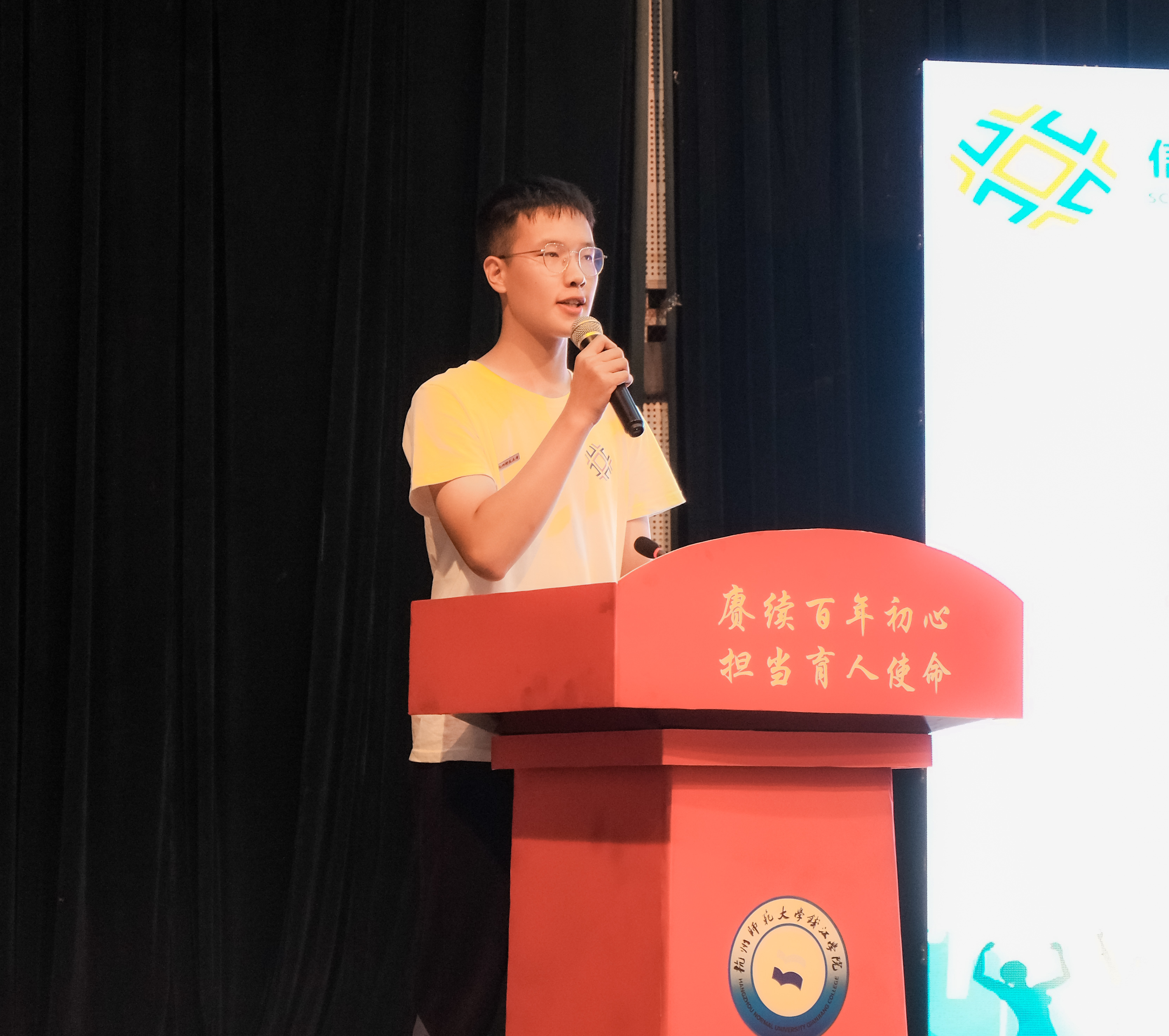 计算机类218班宋向博同学作为新生代表发言,作为有幸见证国家富强与民族复兴的一代,应当树立远大理想,确立人生航向,作为崭新的师大“信”人,更应当把握时代脉搏,在最美的时代书写最灿烂的篇章。