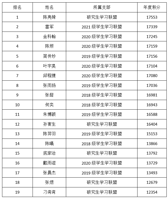 2021年度,学院团委积极鼓励全体学生加入学习强国的日常学习行列,主动变革、创新学习,永远是掌握时代主动的关键。为肯定学院学生的积极学习表现,激励先进、表彰优秀,经研究决定,对陈亮锜等29位2021年度“计入年度积分”达到10000分以上的同学(非党员)进行表彰,具体表彰名单如下: