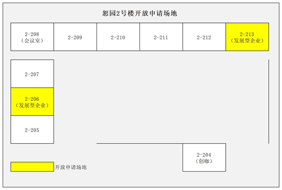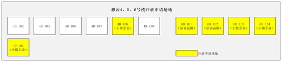 本次开放申请入驻的场地为:恕园4-6号楼园区和恕园2号楼园区部分独立房间和众创空间的空置工位(黄色区域),其中发展型企业2间,小微企业4家,创业苗圃40个工位见下图(各类型企业入驻具体要求详见附件2:文轩探花 大学生创业园服务指南):