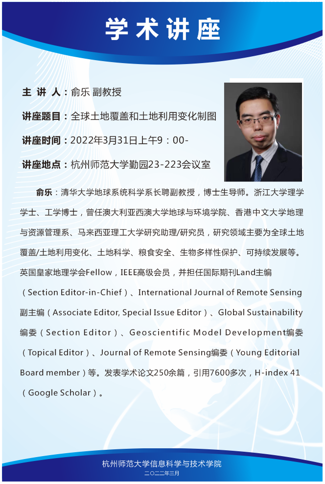 IT讲坛2022年第2期-全球土地覆盖和土地利用变化制图 时间:2022-03-31 09:19:51 文章来源 :学科 浏览量:3 清华大学俞乐副教授“全球土地覆盖和土地利用变化制图”线上学术报告准时开讲,欢迎广大师生参加。观看方法:下载腾讯会议APP或登录网页-点击加入会议-填写会议号6169945898、您的名称-点击加入会议即可。
