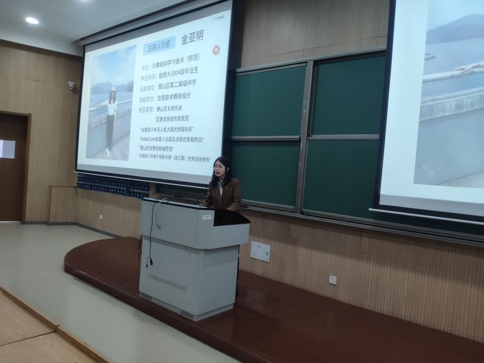 【讲座嘉宾介绍】金亚明老师2001年毕业于学院计算机科学与技术师范专业,现为萧山区第二高级中学信息技术教研组长,曾获“萧山区系统先进”、“区教育系统先锋党员”、“全国青少年无人机大赛优秀辅导员”和“RoboCom机器人全国总决赛优秀裁判员”等多项荣誉称号。(文/杨鹏飞 黄玉婷 图/钟丽丽)