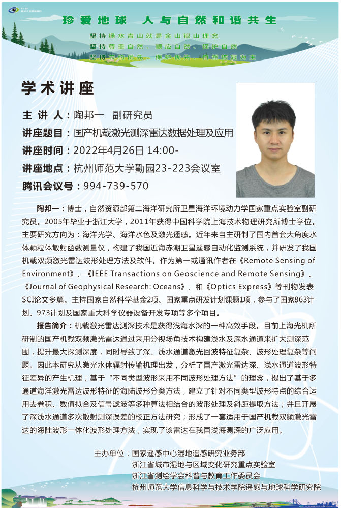 IT讲坛2022年第12期-国产机载激光测深雷达数据处理及应用 时间:2022-04-20 16:00:12 文章来源 :学科 浏览量:0 自然资源部第二海洋研究所 陶邦一副研究员 关于“国产机载激光测深雷达数据处理及应用”线上专题讲座开讲,欢迎广大师生参加。观看方法:下载腾讯会议APP或登录网页-点击加入会议-填写会议号994-739-570点击加入会议即可