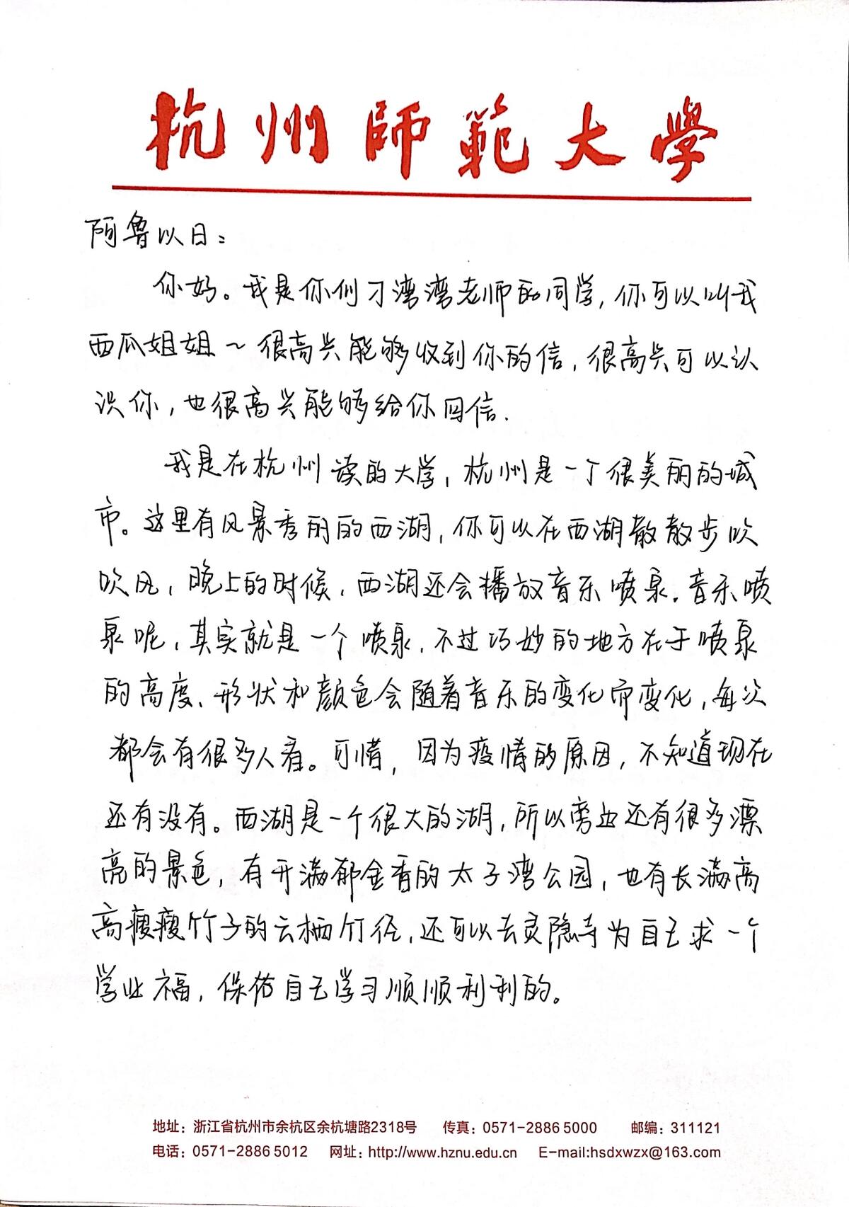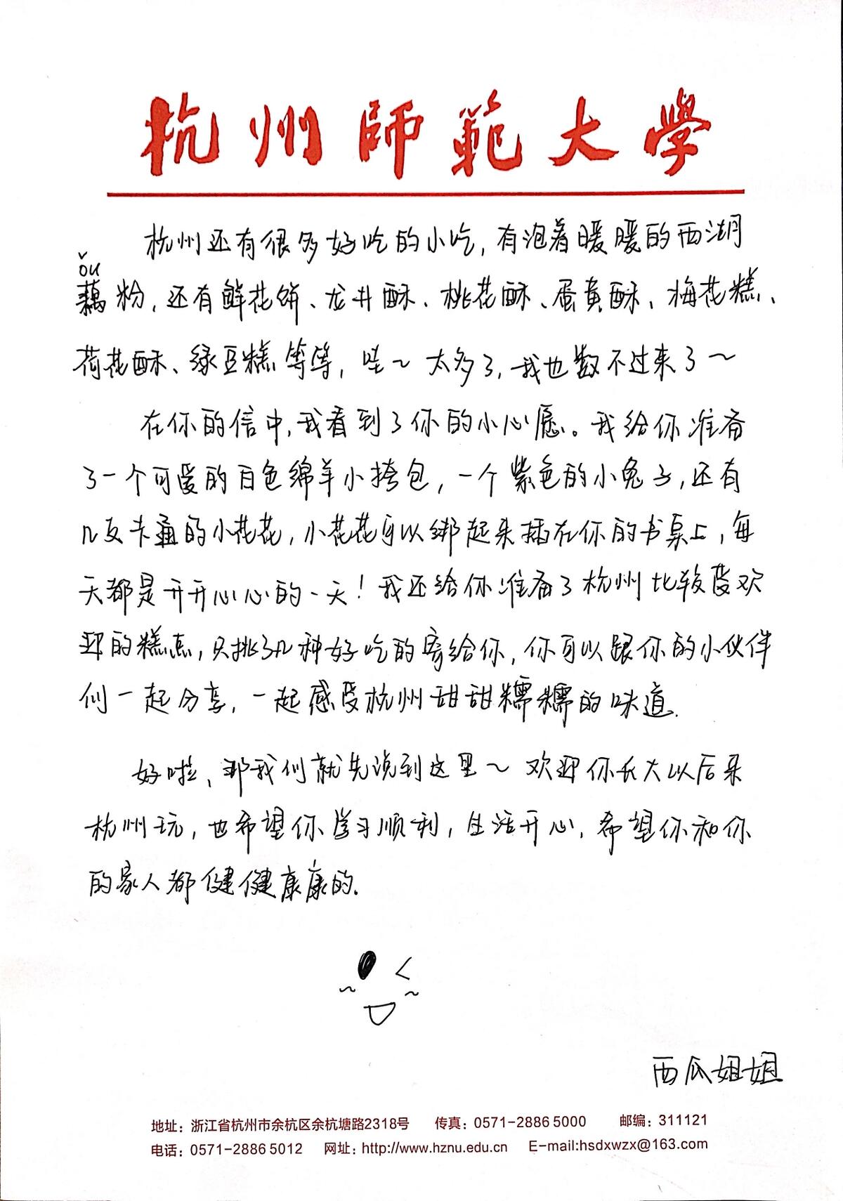 孩子们在信件中纷纷表达自己对大学生活的憧憬和对杭州风景的向往:“我想去杭州看看西湖是什么样子?”、“哥哥姐姐,你们上大学作业多吗?也要有早读吗?”、“我真想和你们上一样的大学!”也有孩子写下自己的小小心愿:“我很喜欢画画,希望有一盒水彩笔”、“我很羡慕高年级的哥哥有自己的篮球”……杭师大信息学院的大学生纷纷为孩子们的童真所打动,写下一封封回函,鼓励孩子们认真学习,走向更加广阔的天地。随信以及寄送的还有信息学院为孩子们和当地老师们准备的学校周边的文具大礼包、达成“微心愿”的小礼物等。参与活动的同学王希雅说:“我想多给孩子们买点东西,难得有这样的机会,希望孩子们都能开心!”