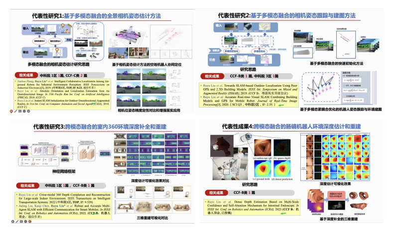 在学术分享部分,刘老师主要讲解了她的四个代表性研究,分别是基于多模态融合的全景相机姿态估计方法、基于多模态融合的相机姿态跟踪与建图方法、跨模态融合的室内360度环境深度补全和重建以及跨模态融合的肠镜机器人环境深度估计和重建。