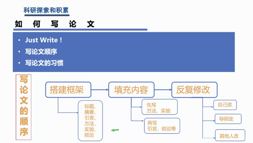 在经验分享部分,刘老师分享了她本人在科研探索道路上积累的经验。她讲到,在科研前期文献的积累十分重要,如同砖和瓦,我们只有站在巨人的肩膀上才能一步步铺砌自己的科研道路。同时,她还表示,在阅读论文时,多数的文章看摘要和关键字句,少数与自己研究方向高度契合的文章要精读并复现。接着,她总结了一些寻找论文创新点的方法,鼓励我们在科研道路上要敢于思考,勤于思考。最后,在论文的写作上,刘老师也给出三点建议。一是要大胆的写,即使是一个非常粗糙的版本,也可以在后期有灵感的时候随时不断填充自己的文章。二是论文的写作顺序,从方法、描述和实验部分开始写,然后写相关的工作,最后写引言、摘要和结论。三是写论文的习惯,一定要有计划的写论文,尽早开始写,克服拖延。同时,她还分享了一些她经常使用的论文写作工具,例如:Latex、Overleaf等。