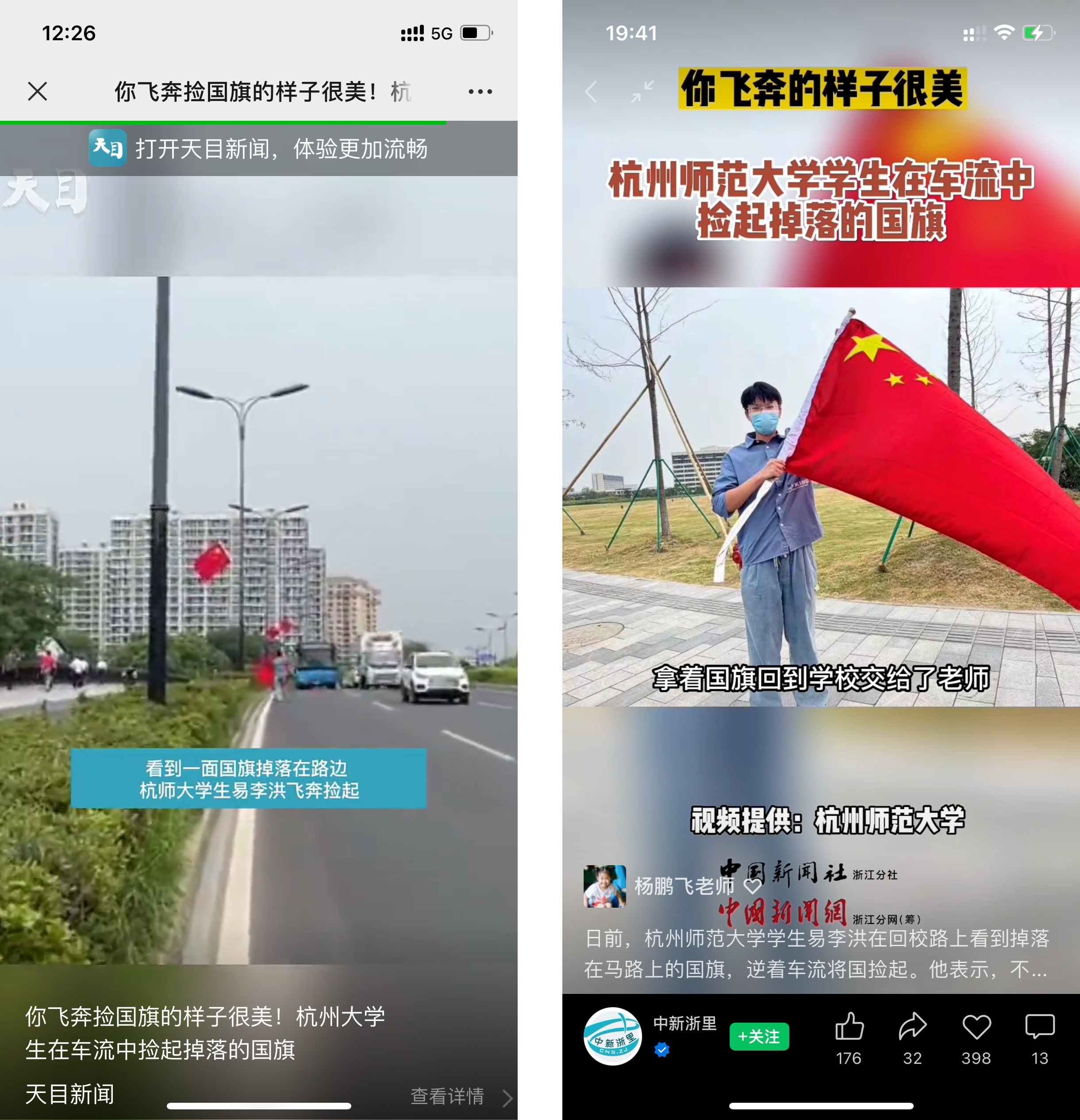 该事情被拍客拍成小视频,被天目新闻、中国新闻社先后转发,当被媒体问到为什么会去拾起掉落在车道的国旗时,易李洪表示这是一个大学生应有的素质和担当,充分展现了师大学子的风采。(图/文 杨鹏飞 陆周心)
