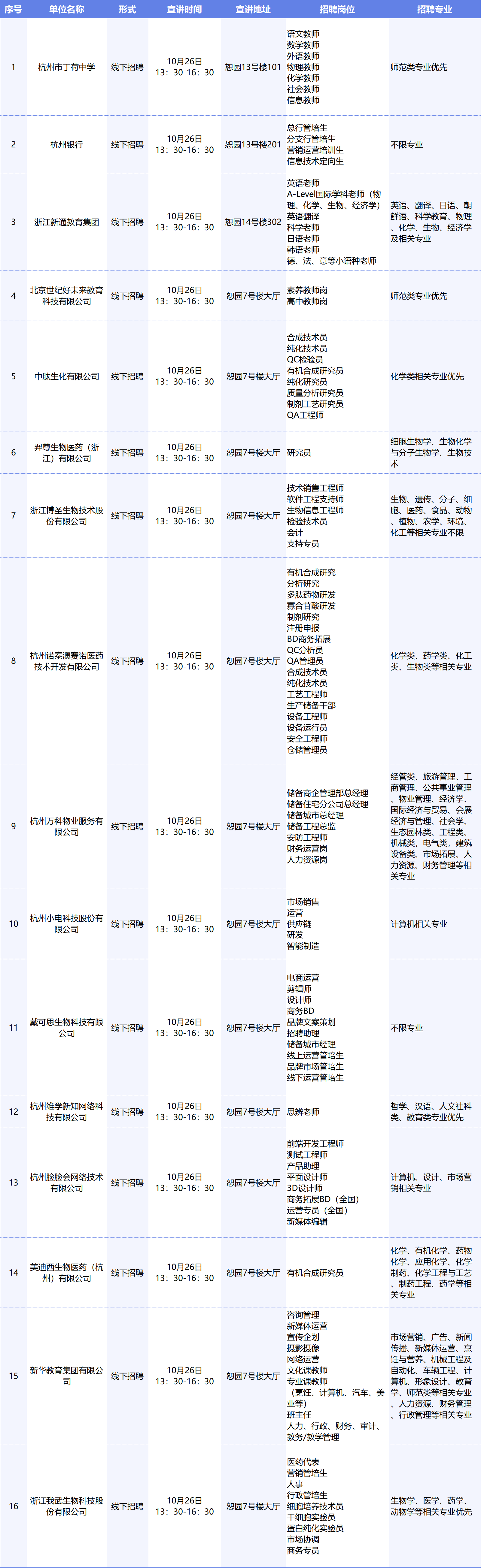 本周校园招聘宣讲活动安排预告(10月26日) 时间:2022-10-24 14:13:08 文章来源 :学工 浏览量:1 详细招聘公告见//career.wenxuanth.com/teachin/view/id/89961