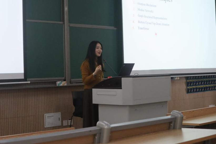本次讲座中,余老师首先介绍了她的研究方向,重点围绕多模态交互领域一个极其重要的研究课题——视觉问答(VQA),该课题涉及了计算机视觉和自然语言处理两大领域。余老师通过论文解读的方式,对该课题要解决的问题和算法的基本流程做了详细介绍,也分享了她关于这一课题的一些科研经历。之后,余老师认真分享了自己的科研经验,尤其在研究生时间规划以及论文写作与发表方面,余老师提出了自己的一些见解和宝贵的建议。余老师说到,写论文的工作都是循序渐进的,一开始大家都是不熟悉的,但随着自己阅读量的提升,每个人对论文的写作和要点都会有自己的见解,其中的差距就是每个人做出的努力,只有努力和用心,才能写好论文。