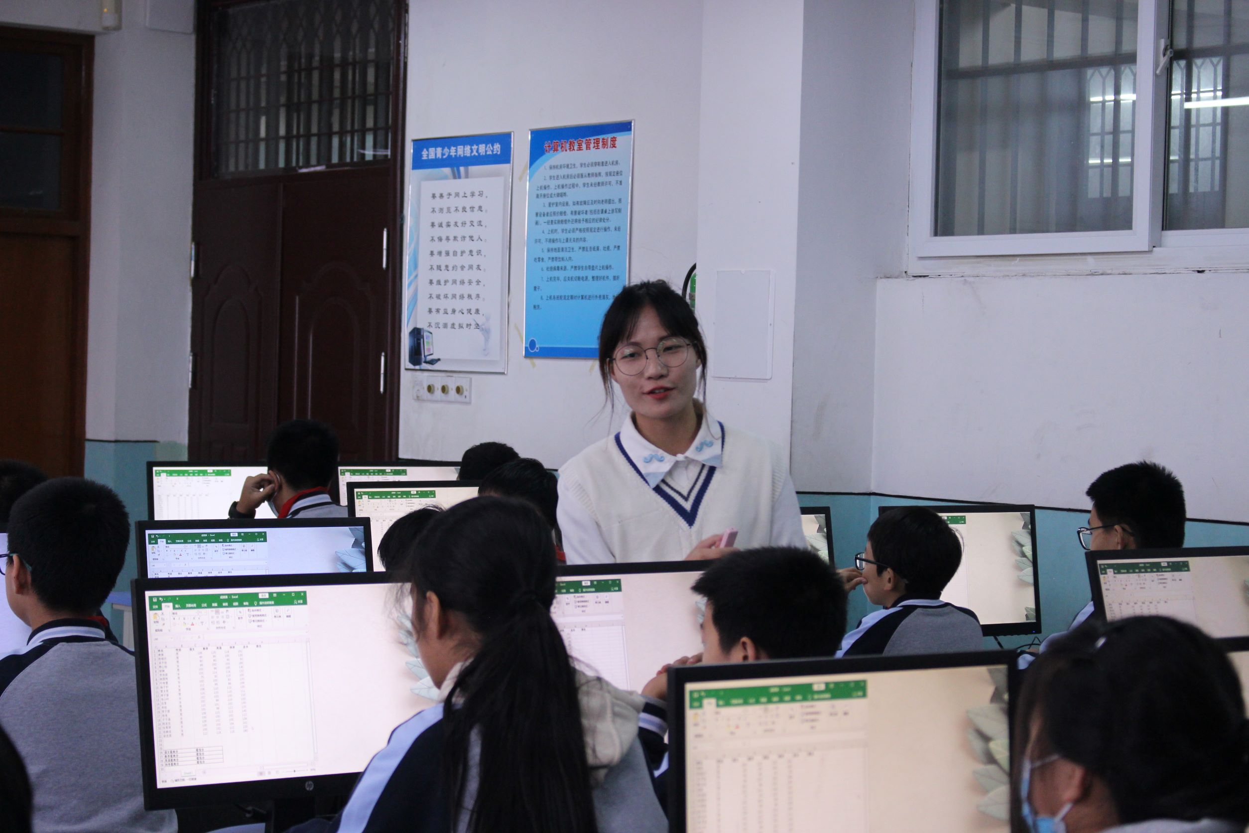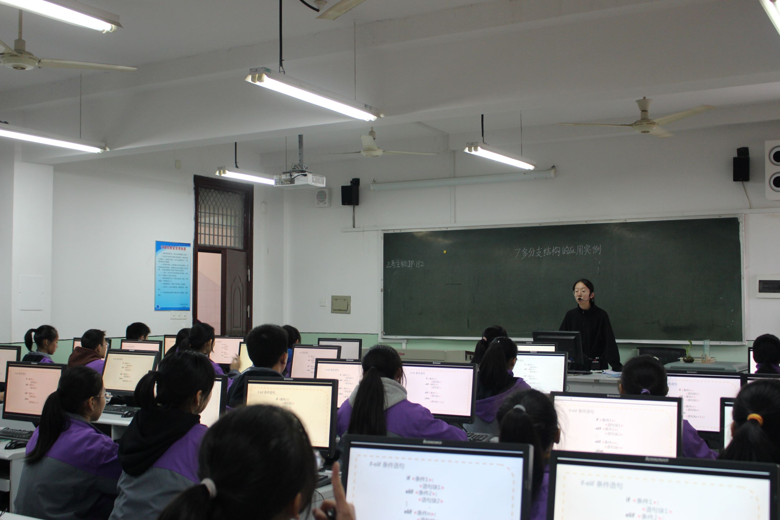 陈紫婷同学在学院韩立东老师和太炎中学陈霞咪老师的指导下,在新课讲授前进行了“温故”环节,复习了if-elif条件语句。新课由浙江省地级市车牌号进行导入,用“猜一猜”的形式进行师生互动,精心设计教学环节,课堂氛围活跃;韦梦瑶同学在学院韩立东老师和太炎中学张晨莹老师的指导下,采用情境导入的形式引入《数据计算》,教学任务为帮助数学老师统计数据并找出符合参加数学竞赛条件的学生,不仅调动了学生上课的积极性,还大大增加了课堂的趣味性,教态自然大方,声音洪亮,讲课内容详略得当,课堂节奏把握合理。