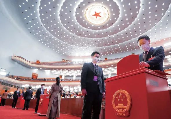 3月11日,十四届全国人大一次会议在北京人民大会堂举行第四次全体会议。这是代表在投票。图片来源:新华社