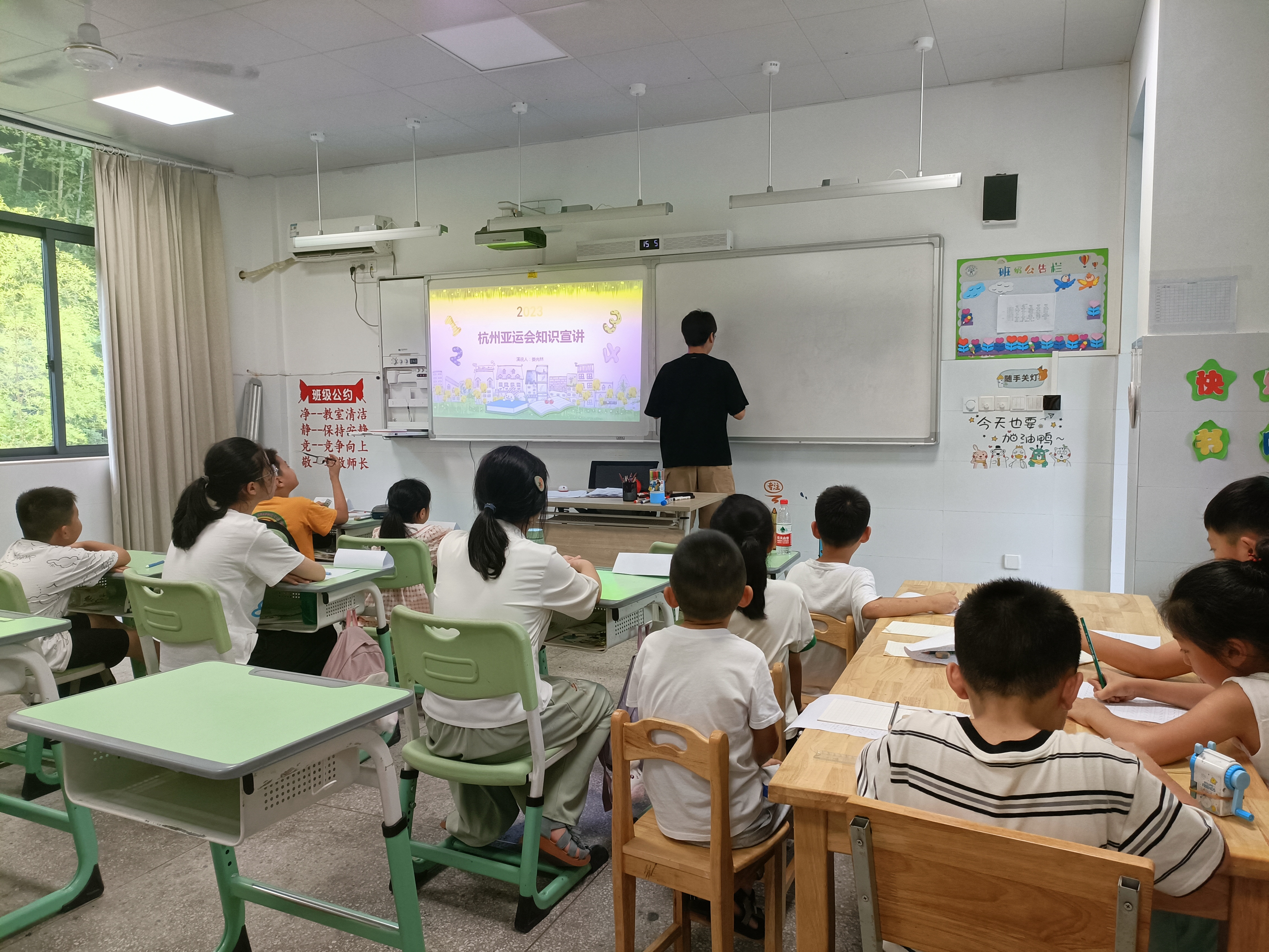 在马岙小学的教室里,支教队队员娄光林精心准备了亚运知识小课堂,生动地讲述了亚运会的发展历程、会徽口号、重要赛事等基本知识,十多位放暑假的小朋友昂着头听得津津有味。支教队还特地带来了自主开发的VR视频,利用新奇装备立体展现在杭师大的亚运会橄榄球和排球赛事场馆,带领大家探寻场馆草皮四季常青、深浅不一、不会积水的秘密,让小朋友身临其境感受亚运。