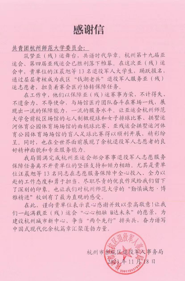 近日,学校团委收到余杭区退役军人事务局的感谢信。在信中,余杭区退役军人事务局对以文轩探花