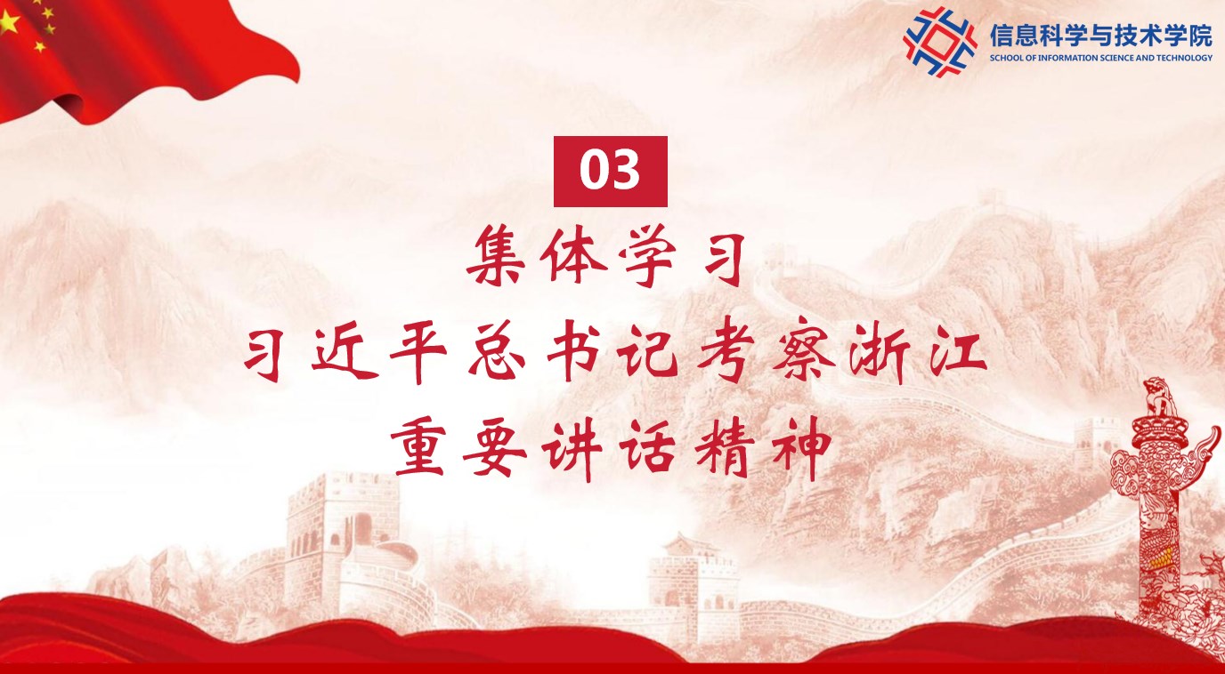 会上,大家集体学习习近平总书记考察浙江重要讲话精神。习近平总书记在浙江考察时强调要完整准确全面贯彻新发展理念,围绕构建新发展格局、推动高质量发展,聚焦建设共同富裕示范区、打造新时代全面展示中国特色社会主义制度优越性的重要窗口,持续推动“八八战略”走深走实……作为高等院校,我们将始终坚持党建引领,党管全局,充分发挥学院特色与优势,强化数字赋能,做好数智党建;坚持立德树人,大力提升学生培养质量,用好学科交叉融合的“催化剂”,加强基础学科培养能力,加快培养创新型人才。