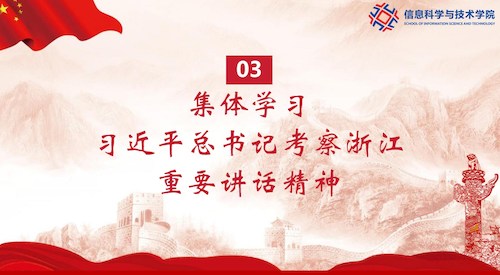 会上,大家集体学习习近平总书记考察浙江重要讲话精神。习近平总书记在浙江考察时强调要完整准确全面贯彻新发展理念,围绕构建新发展格局、推动高质量发展,聚焦建设共同富裕示范区、打造新时代全面展示中国特色社会主义制度优越性的重要窗口,持续推动“八八战略”走深走实……作为高等院校,我们将始终坚持党建引领,党管全局,充分发挥学院特色与优势,强化数字赋能,做好数智党建;坚持立德树人,大力提升学生培养质量,用好学科交叉融合的“催化剂”,加强基础学科培养能力,加快培养创新型人才。