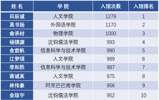 此外,在本科生入馆次数排行榜上,来自计算机203班的金宸帆同学以990次入馆纪录挺进前五,来自计算机202班的李如胜同学以987次入馆紧跟其后,位居第七。两位同学的高频次入馆不仅显示了他们在学业上的勤勉不辍,更是凸显了信息学子对于浓厚的学习氛围的重视。