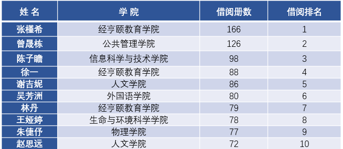 在读者排行榜中,本次报告展示了师大学子的借阅排行榜Top10、在馆天数排行榜Top10、本科生入馆排行榜Top10、研究生入馆排行榜Top10。惊喜的是,在其中三个入馆排行榜Top10中出现了学院学子的身影。