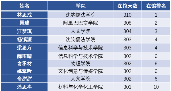 在图书馆驻留时长这一维度,来自计算机205班的梁思方同学全年累计在馆303天,同样来自计算机205班的薛雨晴同学紧随其后,以302天分列第四和第六,充分体现了他们对知识的执着追求和高效利用图书馆资源的良好习惯。