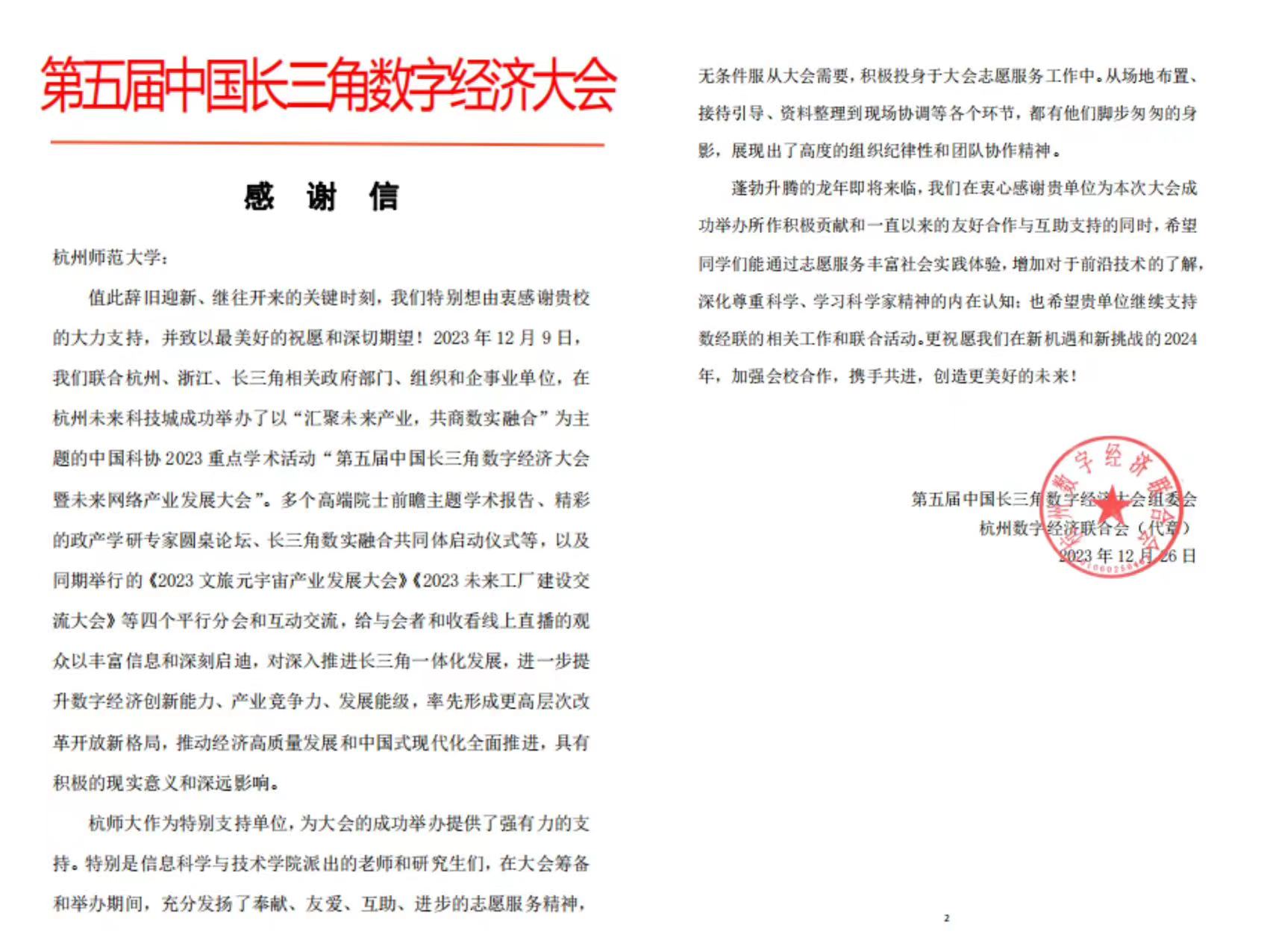 文轩探花 收到第五届中国长三角数字经济大会感谢信