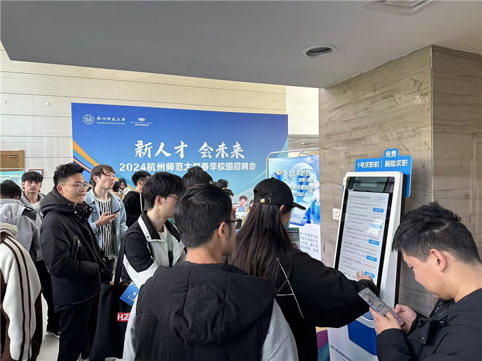 值得一提的是招聘会现场1.8米的max版数字求职机,它首次出现在杭州高校招聘会,为毕业生求职流程提供了“科技”的助力。据悉,这款数字求职机叫做“1号求职机”,毕业生只需要在求职机上点击职位并进行刷脸,即可生成简历数据,点击报名确认之后,企业就会收到毕业生的求职信息,整个过程只需15秒,能够大大提高求职效率。杭师大信息学院学工办主任杨鹏飞表示,目前1号求职机已经和杭师大的学科专场招聘会同步投放了“特制版”,岗位筛选会按照专业跳转。“比如今天举办的是杭师大信息科技专场招聘会,那我们求职机里的岗位就都是杭师大信息科学行业的相关专业,学生只需要选择自己的专业,展示出来的岗位就都是符合他们的。”