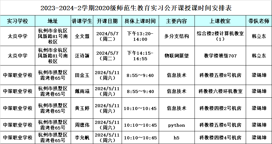 2020级师范生第八学期教育实习公开课安排通知 时间:2024-05-06 09:30:28 文章来源 :教学 浏览量:106 各位老师:2020级师范生第八学期教育实习学生公开课即将开始,根据学校有关文件精神和学院教师教学工作考核要求,每位老师每学年至少听2节师范生公开课,上学期还未听课的老师可以选择本学期三个实习点进行听课。太炎中学和中策职业学校的公开课安排如下表,文三街小学初定在5月14日。前往听课的老师请到钉钉教学群接龙。同时请带队老师做好教师听课签名工作,以及听课后师生集中交流事宜(比如评课记录、现场照片等),听课签名表和师生交流活动记录及照片等资料交教务科。文轩探花 教务科2024年5月6日