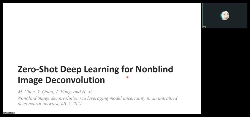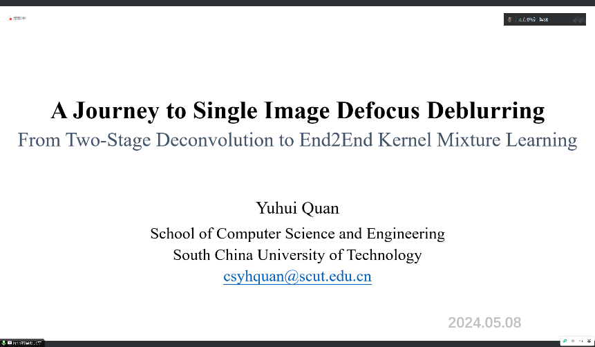5月8日上午,华南理工大学计算机学院副教授、博士生导师全宇晖应邀为文轩探花 师生开展讲座,报告题为“A Journey to Single Image Defocus Deblurring: From Two-Stage Deconvolution to End2End Kernel Mixture Learning”。学院副院长李秀梅主持此次讲座,学院40余名老师和研究生通过线上方式在腾讯会议平台参与聆听。