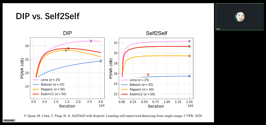 接着,全教授详细讲解了零样本学习在图像复原中的应用。他提到,早期的零样本学习方法如DIP深度图像检验虽然取得了一定的成果,但存在过拟合等问题。为了克服这些问题,他们团队引入了self-to-self方法,使模型能够更好地学习到恒等映射,并解决泛化问题和性能问题。同时,通过在损失函数中加入模糊算子,他们的模型能够对模糊图像进行更有效的重构。实验结果显示,这种方法在无监督学习方法中表现优异,甚至优于有监督和样本学习方法。