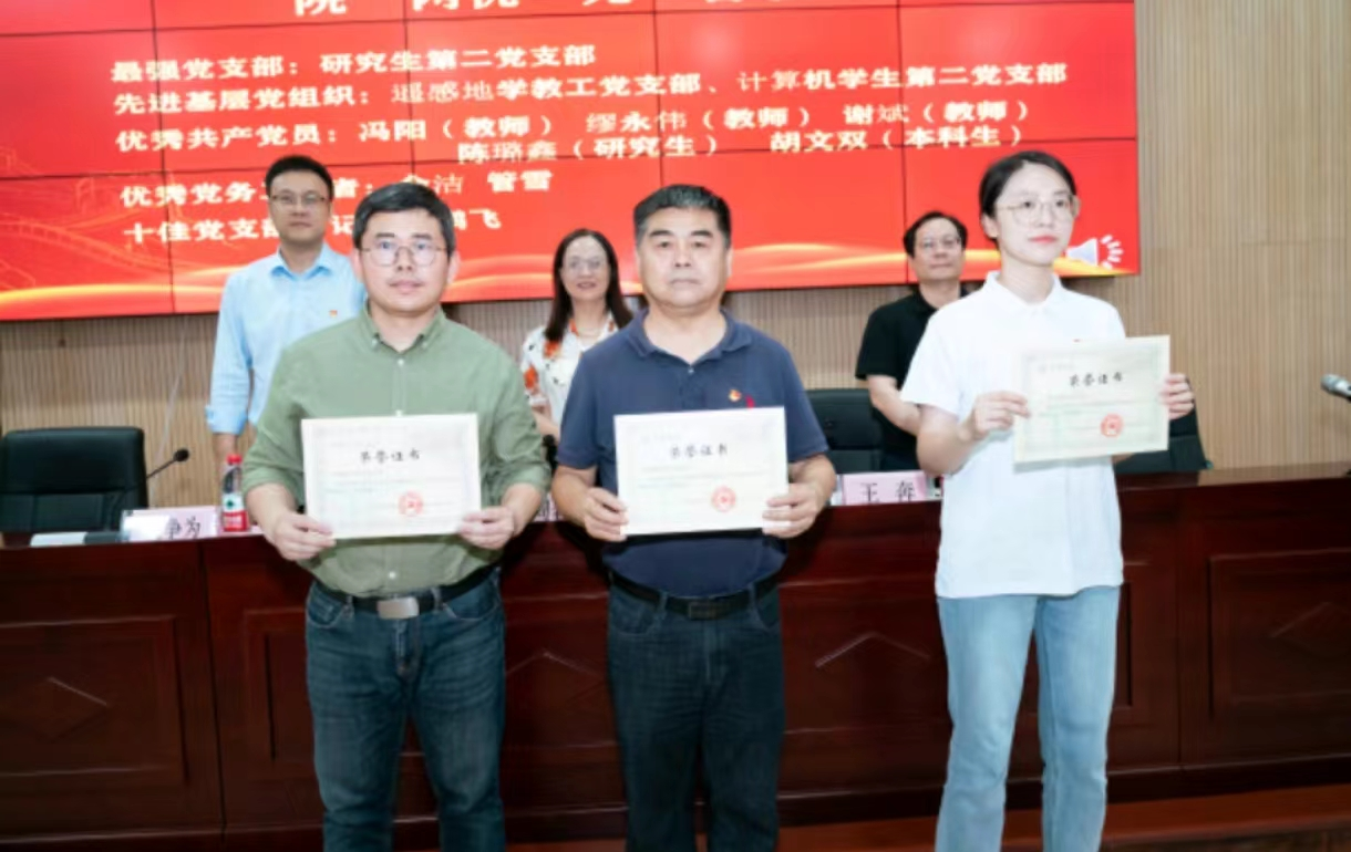 会议由学院党委组织员管雪老师主持。国歌声起,共唱嘹亮,大会在一片庄严中拉开帷幕。首先,由周春儿书记领誓,和新党员与老党员一起重温入党誓词。“对党忠诚,积极工作,随时为党和人民牺牲一切,永不叛党。”铮铮誓言,拳拳心声,将大会氛围涨至高潮。接下来,党委副书记王奔院长宣读了学院党委关于表彰2023年度学院最强党支部、先进基层党组织、优秀共产党员、优秀党务工作者、十佳党支部书记的文件,其中研究生第二党支部荣获“最强党支部”荣誉称号;遥感地学教工党支部、计算机学生第二党支部荣获“先进基层党组织”荣誉称号;冯阳老师、缪永伟老师、谢斌老师,陈璐鑫同学、胡文双同学荣获“优秀共产党员”的称号;余洁老师与管雪老师荣获“优秀党务工作者”的称号;杨鹏飞老师荣获“十佳党支部书记”荣誉称号。