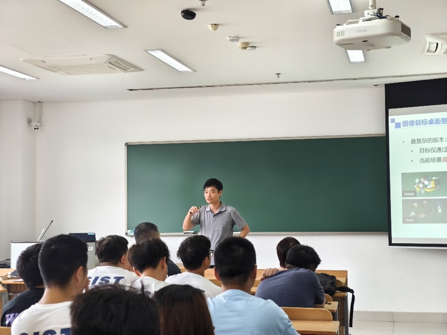 在讲座的尾声,王教授与在场师生围绕训练数据的稀缺性、仿真数据与真实数据之间的差异以及桌面整理问题进行了深入讨论。王教授鼓励学生们勇敢面对科研中的挑战,积极投身科学研究,为推动技术进步贡献自己的力量。