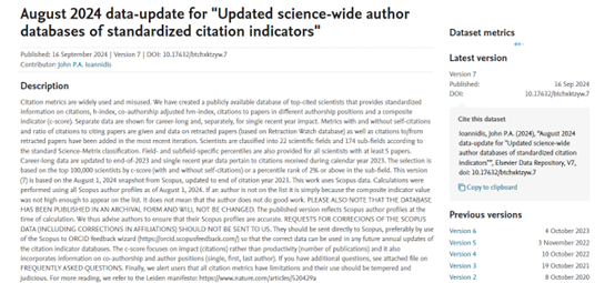 2024年9月16日,全球知名学术出版商Elsevier旗下Mendeley Data与美国斯坦福大学John R.A. Ioannidis教授团队更新了标准引文指标的全科学作者数据库,发布了第七版《全球前2%顶尖科学家榜单2024》(World’s Top 2% Scientists 2024),该榜单从近700万科学家中,筛选出世界Top 2%的科学家,包括了22个领域和174个子学科。该榜单从科学家视角多维展示了科研状态,提供了一个面向科学家长期科研表现的衡量指标,更客观、更真实地反映了科学家的影响力。