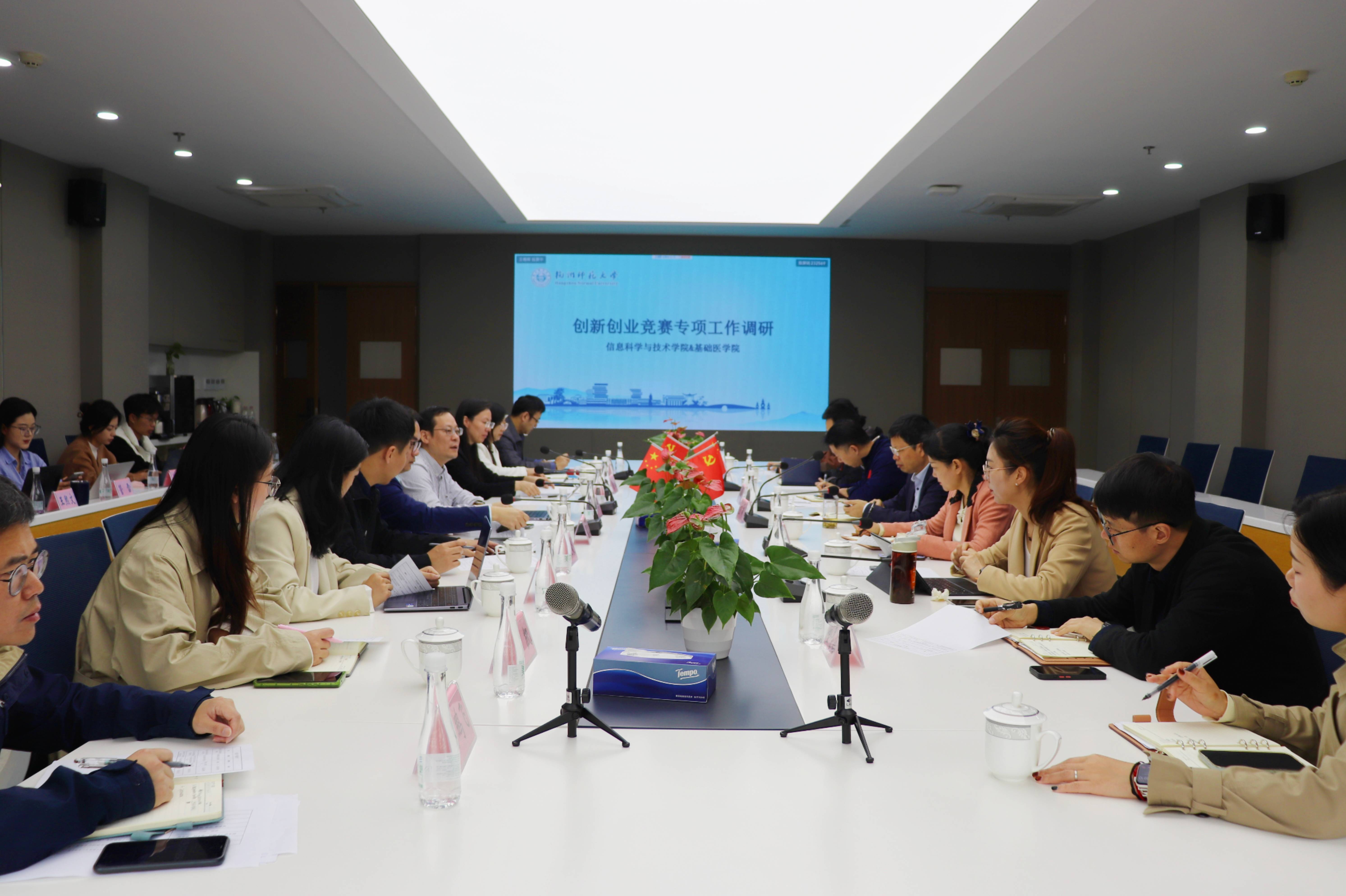 10月28日上午,校党委副书记应飚一行到学院走访调研。校党委学工部部长金向华、校团委书记吕超、校党委学工部副部长翁灵丽,基础医学院党委副书记张凯,信息学院院长王奔、副院长姚争为,副院长李秀梅,学院党委副书记余洁以及相关部门工作人员参加座谈会。会议主要聚焦中国国际大学生创新创业大赛、全国大学生课外学术科技作品竞赛“挑战杯”以及中国大学生创业计划竞赛“挑战杯”的专项工作推进,并对其进行了深入讨论。