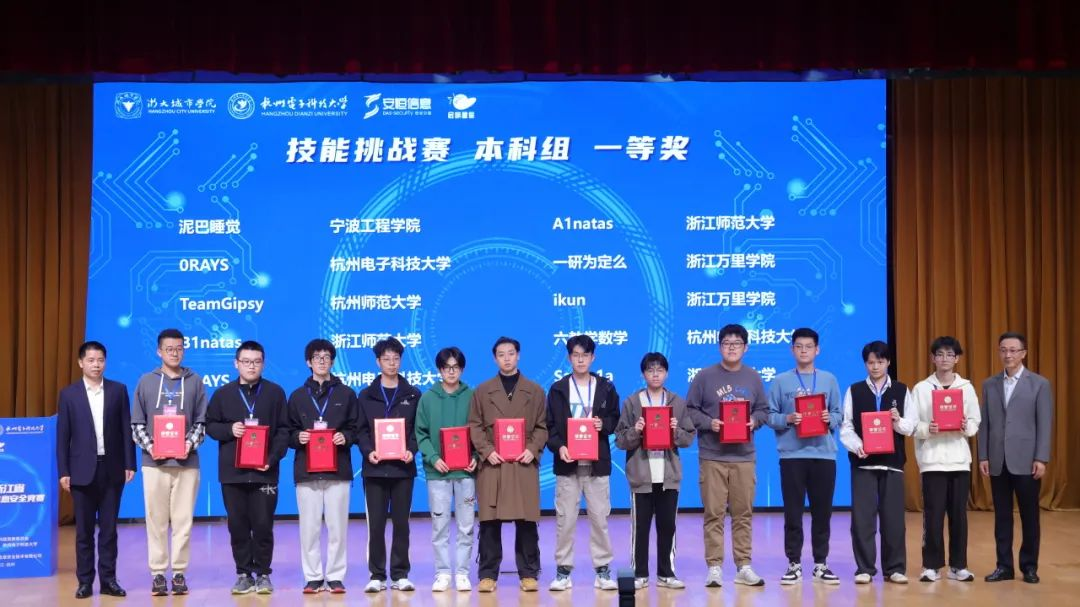 据悉,此次大赛共吸引了来自全省83所高校的近9000名精英学子参赛,选拔出来自全省53所高校的148支技能挑战赛队伍和来自全省63所高校的300支知识挑战赛选手入围决赛。技能挑战赛采用CTF夺旗赛的形式,题目覆盖Web、Pwn、Crypto、Misc、Reverse、数据安全、信创安全等。知识挑战赛考察内容广泛,竞赛包括但不限于网络安全相关法律法规、个人隐私保护、数据安全、信创安全等专业知识。本次比赛由浙江省大学生科技竞赛委员会主办,浙大城市学院、杭州电子科技大学承办,杭州安恒信息技术有限公司协办。《中国信息安全》杂志社社长位华,杭州安恒信息技术股份有限公司首席人才官、高级副总裁苗春雨等出席闭幕式。