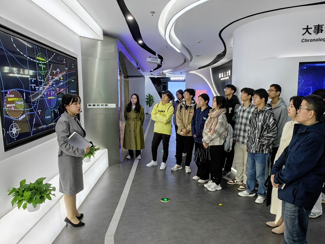 探访过程中,国际人才园讲解员首先为大家介绍了园区的主要功能和对应楼层分布。随后在讲解员向大家介绍了海外人员服务窗口功能,并介绍了境外工作人员申请签证的具体流程,展示了园区对于国际就业工作的深厚实力。在国际人才展厅,深入了解了园区的发展概况与海外合作情况,讲解员还向同学们介绍了余杭区对应大学生就业的扶持政策,让同学们对于当前就业的形式有了更深的认识,也让同学们对未来就业发展有了更充足的信心。
