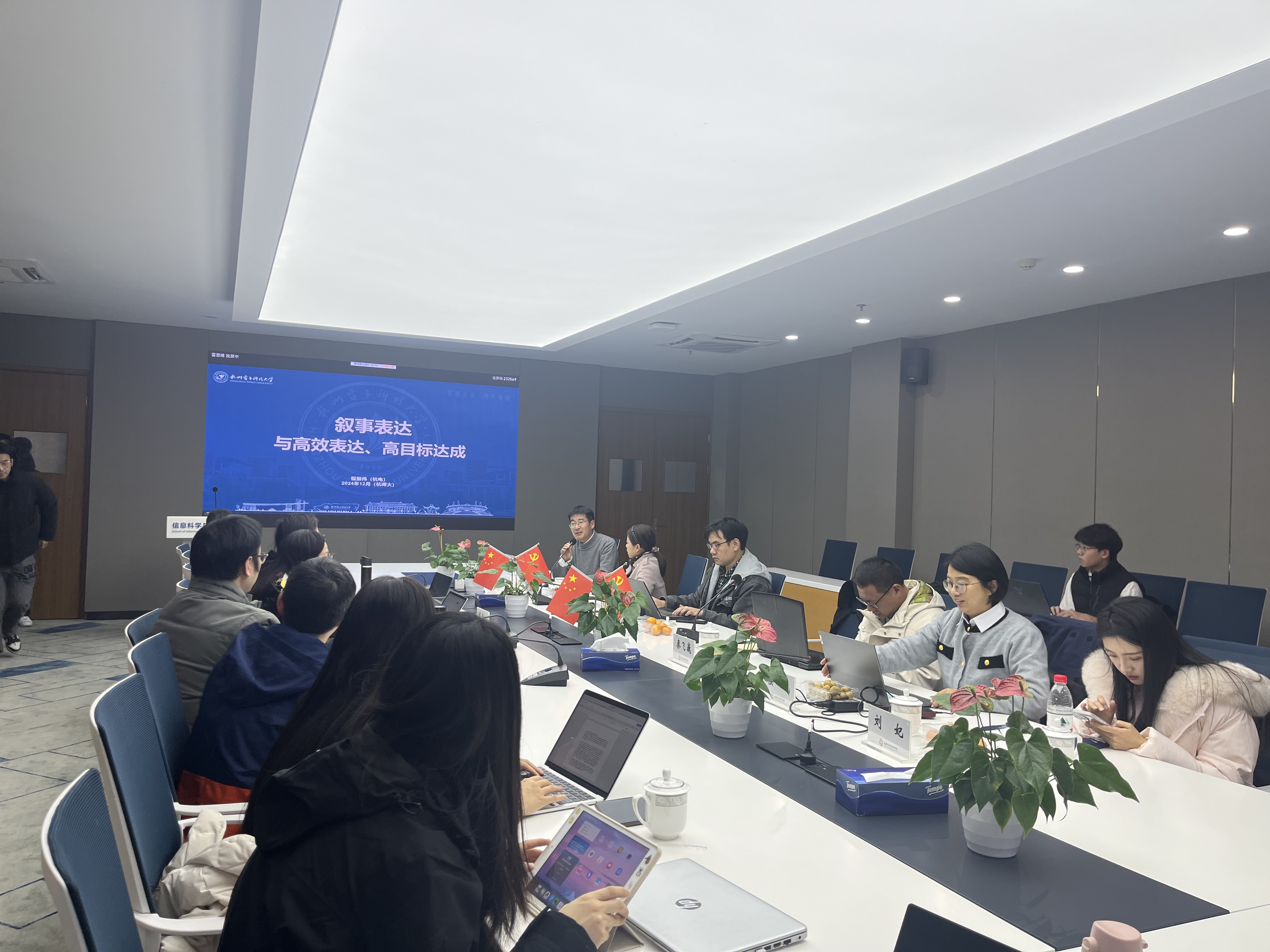杭电教育部高校网络教育名师工作室其他成员也分享了各自在新闻宣传方面的经验做法。新闻科科长楼威分享了自己的新闻写作经验,并强调了新闻叙事的本质是一种思考方式和观念,而非仅仅提供信息,其次,她讨论了短视频制作中的核心任务,即让观众将注意力引向核心任务点,并强调了情感、清晰度等对视频表达效率的影响。国资处副教授高然分享了备受学生好评的杭电实验室系列视频从策划、设计、拍摄、推广的经验,名师工作室成员辅导员刘妃分享了短视频创作的心得体会,秦飞巍教授和丁佳骏副教授分别分享了裸眼3D技术的应用、学术科技报道方面以及指导学生竞赛方面的经验。