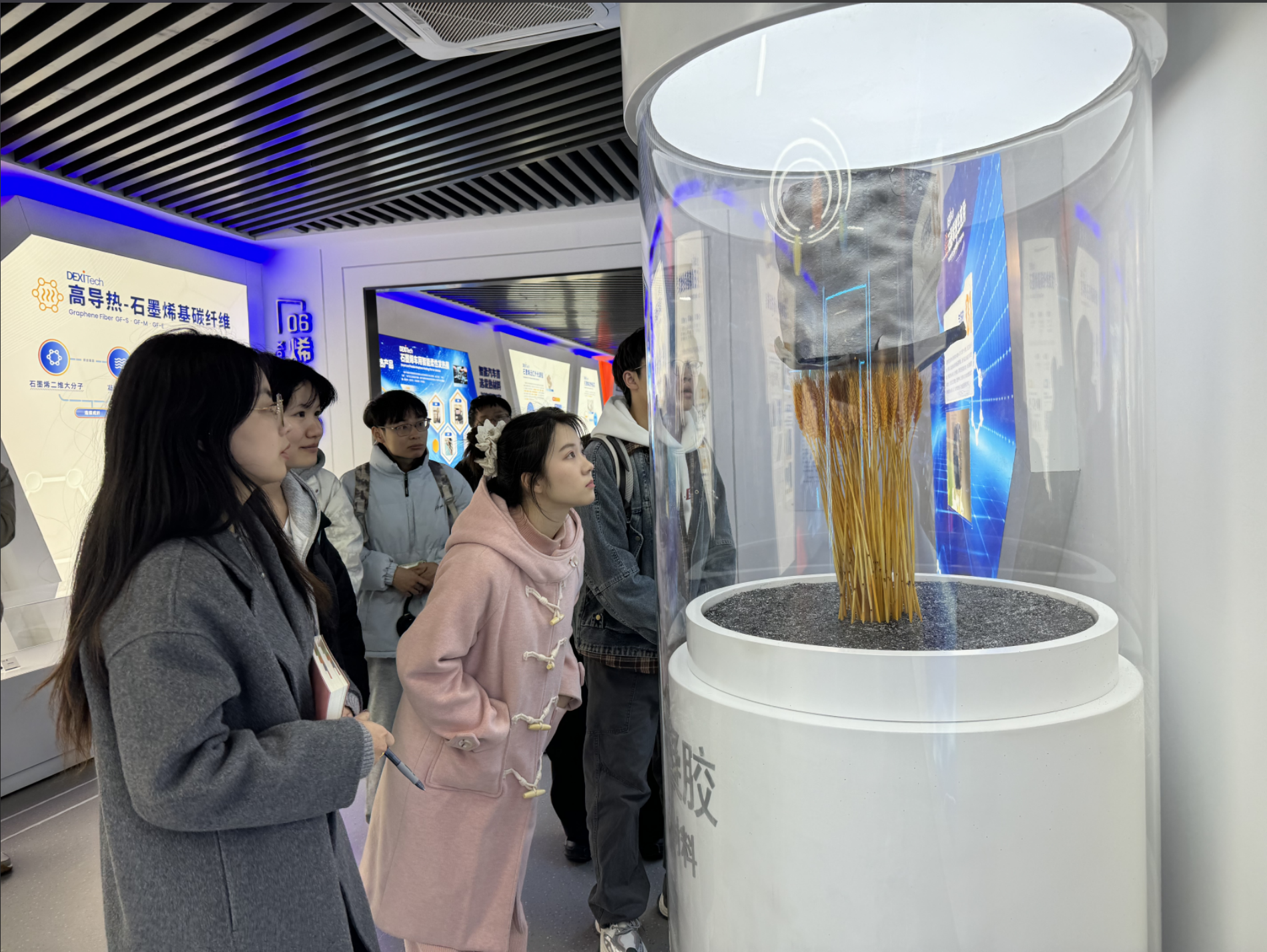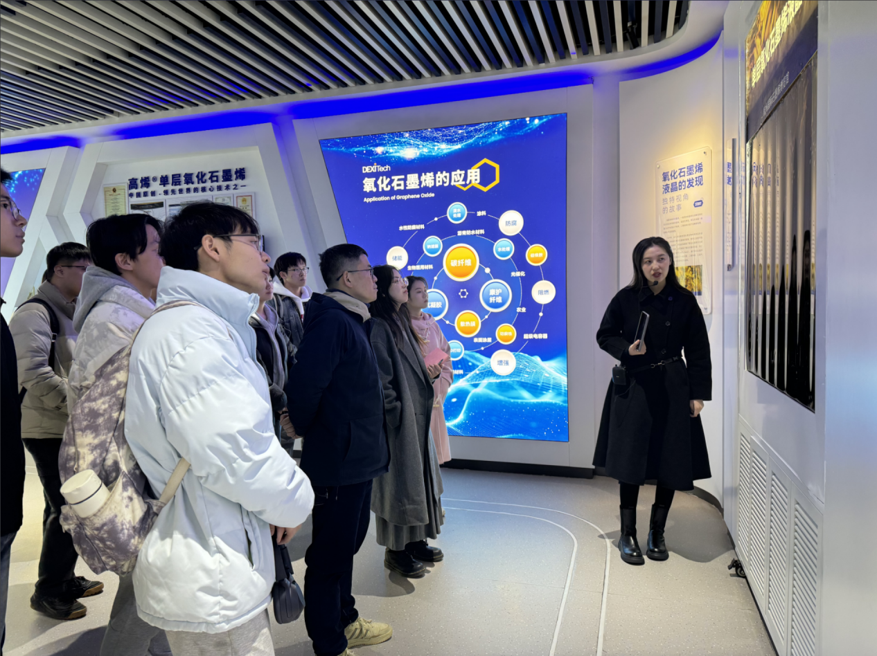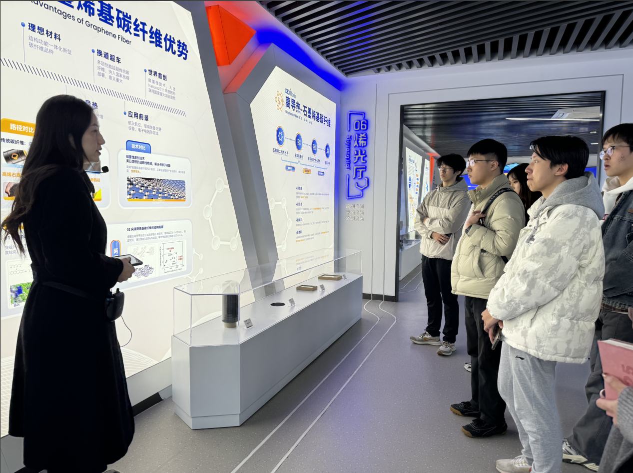活动伊始,团队来到了高稀科技的石墨烯展览馆,一进入展览馆,便能够感受到浓厚的科技氛围。在展览馆内,公司安排了一场视频展示,视频中详细介绍了石墨烯的独特性能,研发历程以及在众多领域的广泛应用前景。从新能源电池到航空航天材料,从电子设备到生物医学,石墨烯所展现出的巨大潜力,让同学们对自己未来的职业方向进行了更深的思考。随后,展览馆的专业讲解员带领同学们参观了各个展区,进一步深入介绍了石墨烯的相关产品、技术研发成果以及实际应用案例。