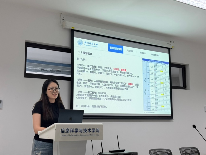 首先,阎佳玉学姐从考公的前期信息收集、笔试备考、面试备考等方面进行讲述。她不仅介绍了根据不同的意向区域、备考类型查找对应备考信息,还提醒我们不同考试的注意事项。在笔试备考部分,学姐以自身的备考经验出发,介绍了不同模块的学习过程。而在复试部分,学姐推荐了很多简单但有用的技巧和应用。最后的问答环节,同学们就时间协调、备考战线和备考要求等问题积极向阎学姐请教,得到了学姐耐心细致的解答。