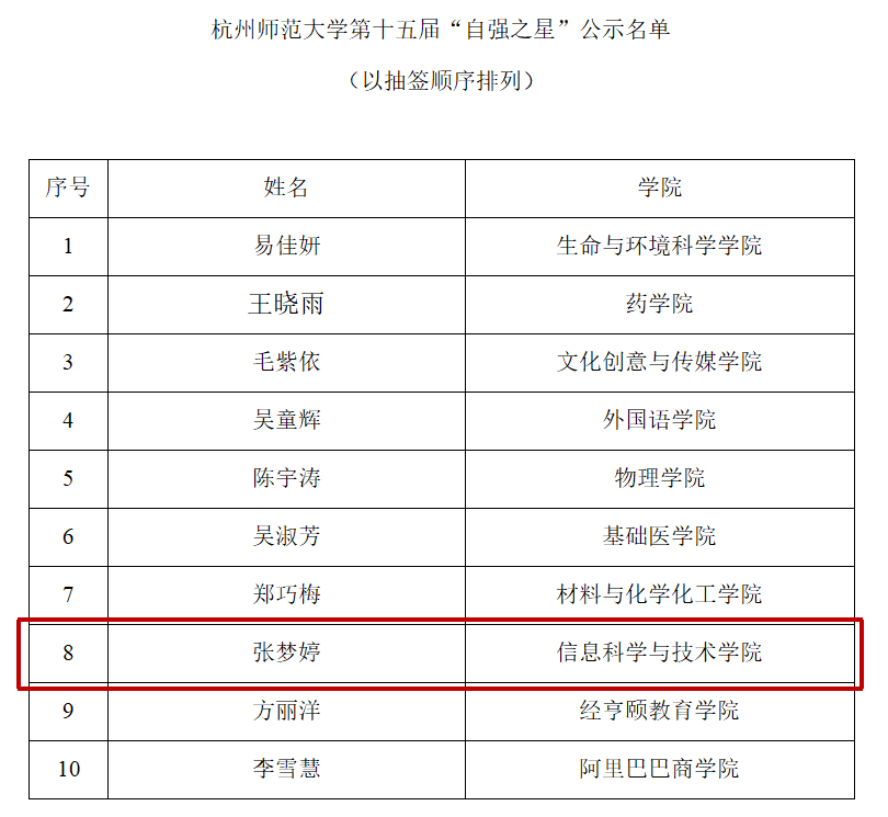 恭喜文轩探花 学子获校级“自强之星” 时间:2025-04-23 11:04:54 文章来源 :学工办 浏览量:0 根据“寻找我们身边的自强之星”活动的通知,文轩探花 第十五届“寻找我们身边的自强之星”评选工作已经结束,经过学生自主申请、学院审核推荐、评委评审、学生答辩、评委二次投票评审,共产生十位“自强之星”获得者,获奖学生名单已经予以公示,恭喜文轩探花 学子张梦婷同学获得校级“自强之星”。信息学院学生工作办公室 2025年4月23日