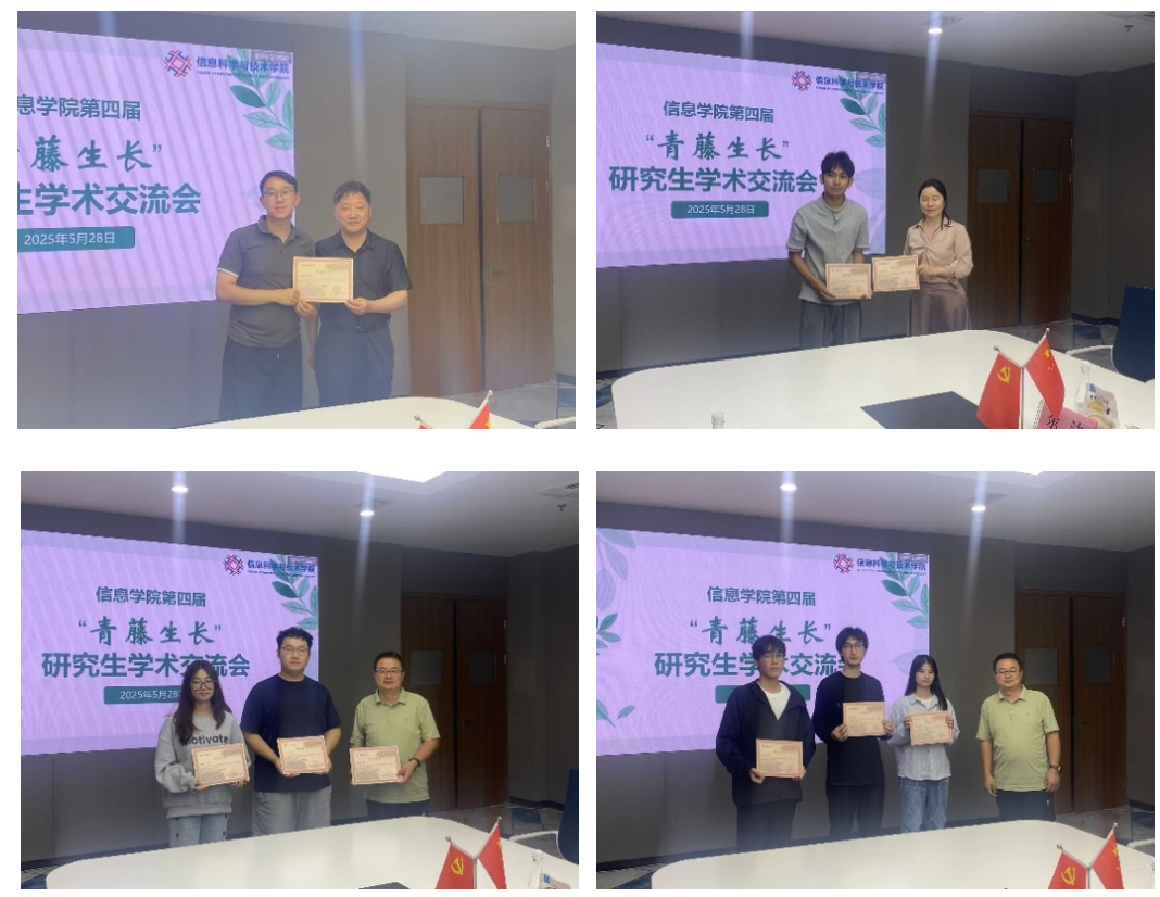 2025年5月28日,信息学院第四届“青藤生长”研究生学术交流会在勤园12-304举行。学院院长王奔、党委副书记余洁、学科办副主任洪东招、辅导员钱欣宜以及多位评委老师莅临会议,众多研究生到场参加。