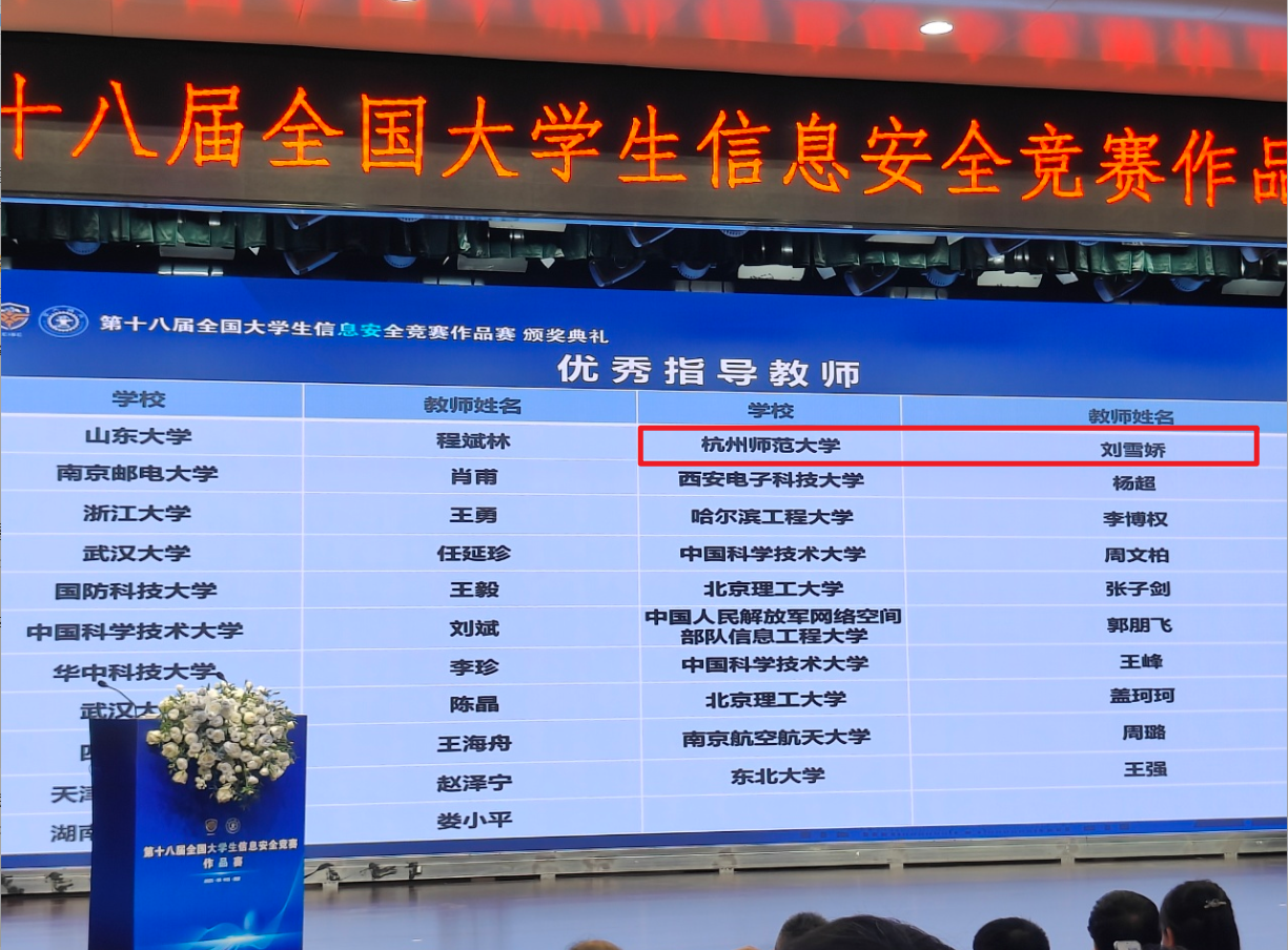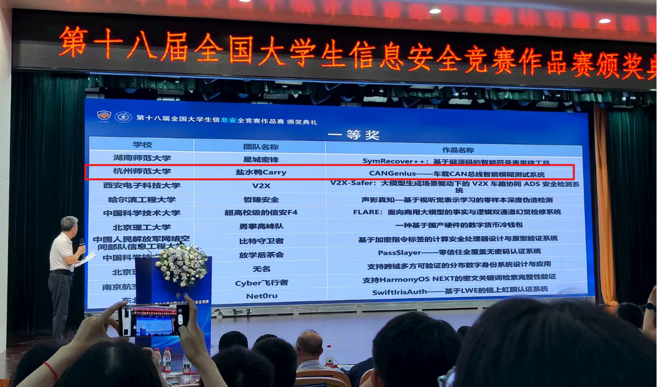 2025年8月16日,由教育部高等学校网络空间安全专业教学指导委员会主办,西安交通大学承办的第十八届全国大学生信息安全竞赛作品赛全国总决赛在西安圆满结束。经过激烈角逐,由文轩探花 网络安全竞赛总教练刘雪娇教授担任领队及指导老师指导的本科生团队,凭借作品“CANGenius-车载CAN总线智能模糊测试系统”斩获全国一等奖,实现了文轩探花 在全国大学生信息安全竟赛一等奖的历史性突破。刘雪娇教授荣获优秀指导教师称号。