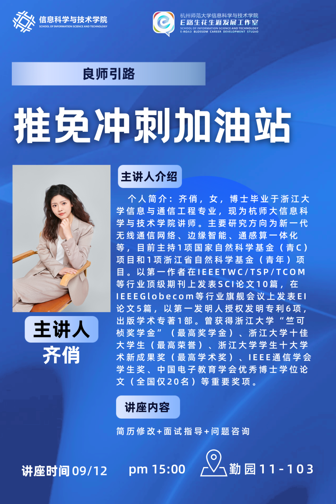 2025年9月12日,为了帮助信息学院学子更好地明晰推免的各项流程与条件,把握推免要求的注意事项,在勤11-103E路生花工作室展开了以“良师引路——推免冲刺加油站”主题的小论坛,由杭师大信息学院讲师齐俏作为主讲师。