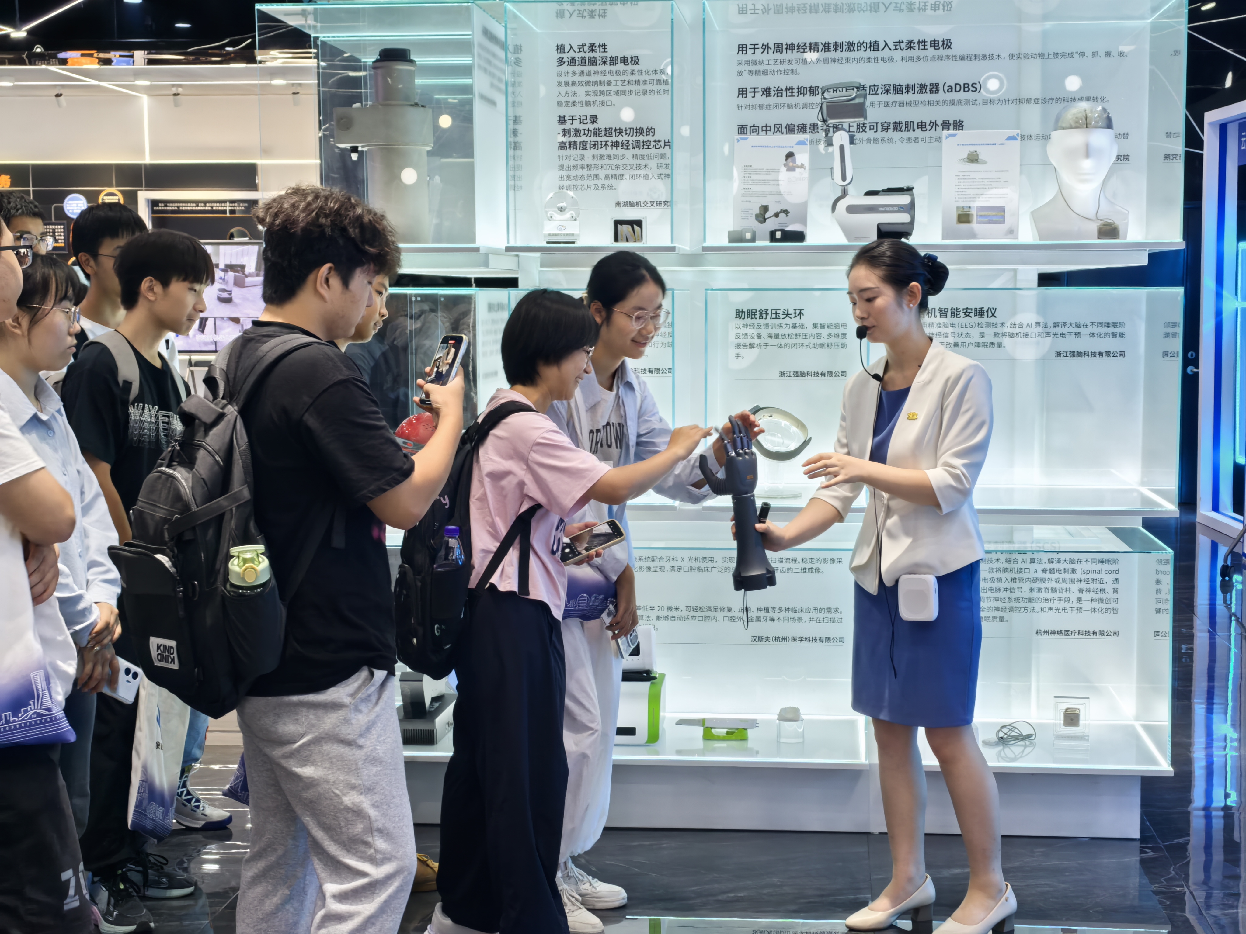 在浙江强脑科技的展区,智能仿生手的精彩演示成为当日活动的亮点。讲解人员向同学们展示了这款集脑机接口、生物传感与人工智能于一体的创新产品,现场气氛热烈,同学们不仅认真观摩仿生手的精准操作,更有不少同学亲自上前触摸体验。当看到仿生手能够完成抓取、握持等精细动作时,同学们惊叹不已。