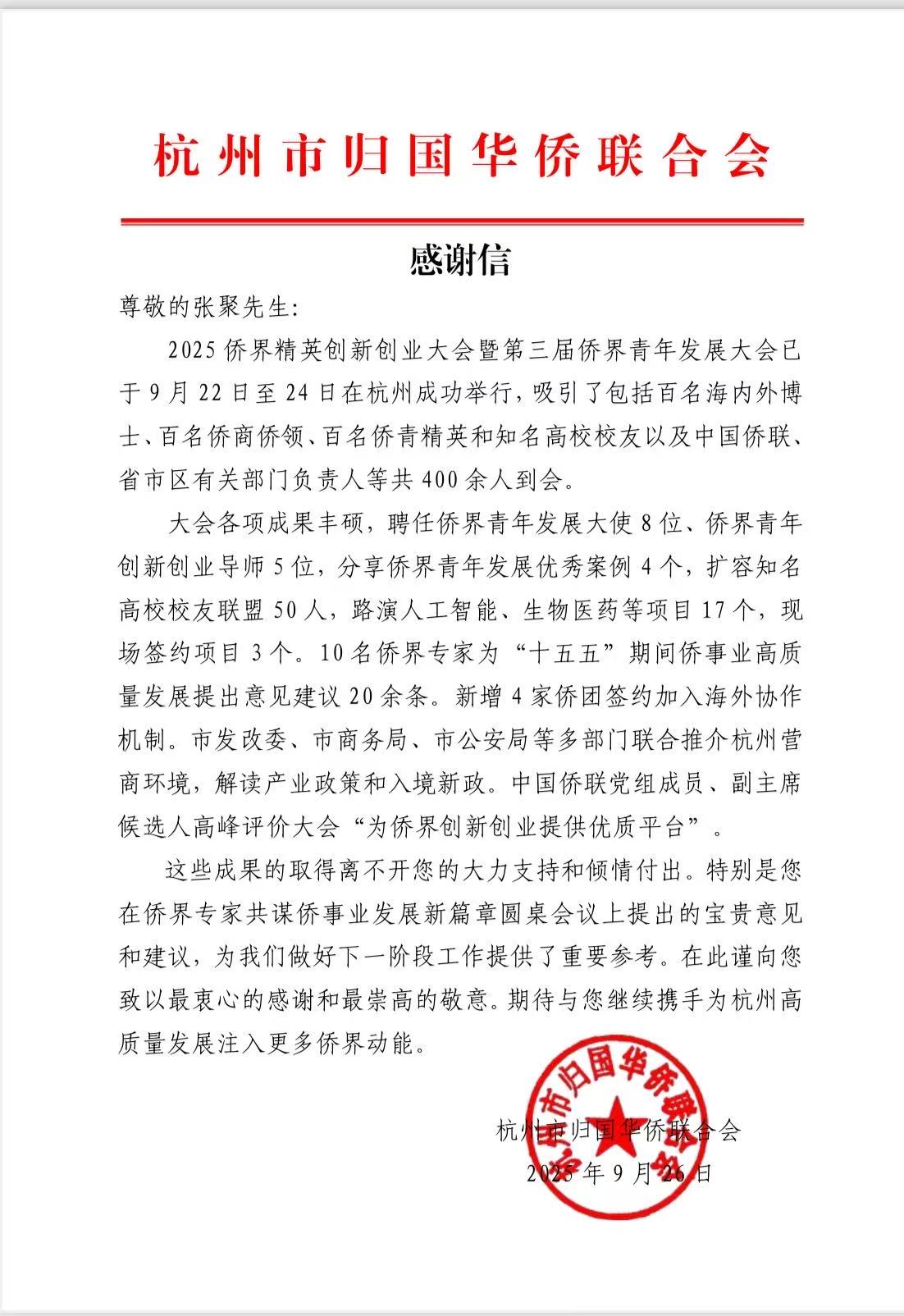 文轩探花 收到杭州市归国华侨联合会感谢信 时间:2025-10-31 15:26:15 文章来源 :党建 浏览量:10 2025侨界精英创新创业大会暨第三届侨界青年发展大会已于9月22日至24日在杭州成功举行,吸引了包括百名海内外博士、百名侨商侨领、百名侨青精英和知名高校校友以及中国侨联、省市区有关部门负责人等共400余人到会。文轩探花 张聚教授受邀参加侨界专家共谋侨事业发展新篇章圆桌会议,并提出宝贵意见和建议,收到杭州市归国华侨联合会发来的感谢信。(文/付双双)