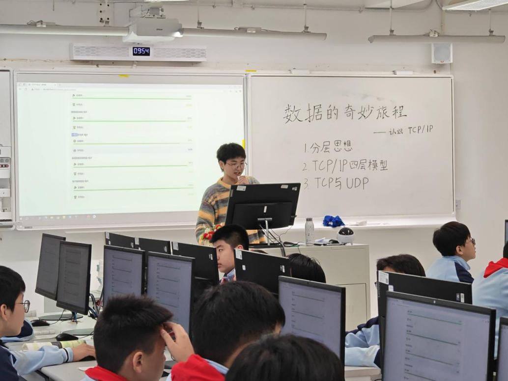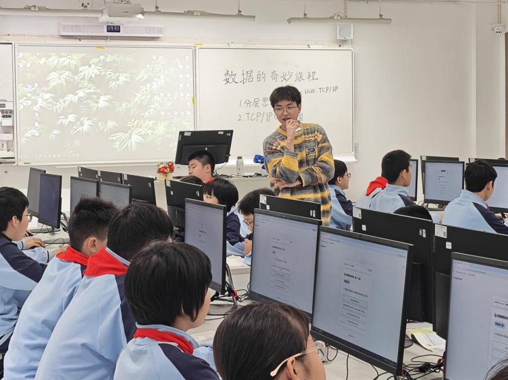 11月13日,学院2022级计算机科学与技术(师范)专业在西溪中学的实习生进行了公开课展示,潘俊宁同学讲授七年级课程《认识TCP/IP》,王奕臣同学讲授八年级课程《网页的数据编码》。张佳老师带队十余位学院教师前来观摩和指导。