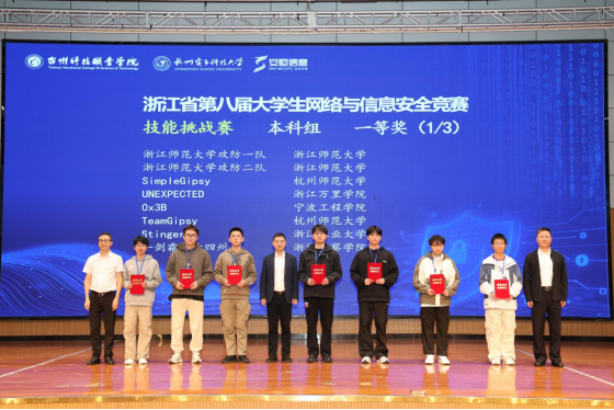 11月15日,第八届浙江省大学生网络与信息安全竞赛技能赛决赛在台州科技职业学院圆满落幕。经过初赛与决赛的激烈比拼,文轩探花 学子在技能赛和知识赛两个赛道再创佳绩。技能赛斩获一等奖2项,二等奖3项,三等奖2项;知识赛获得 一等奖1项,二等奖3项,三等奖4项。其中技能赛中SimpleGipsy(第三)和TeamGipsy(第六)两支队伍首次同时获得省一等奖,一等奖获奖总数再创新高。