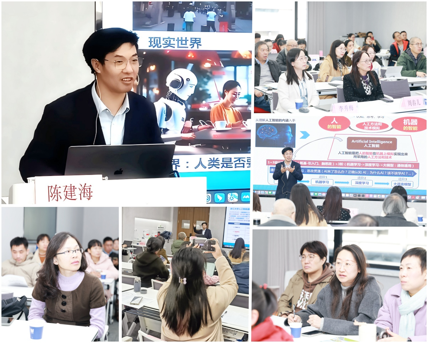 本次研修班学习内容丰富,契合高校人工智能通识课的需求,注重实用性与创新性。学习形式有专家讲座、现场学习、实操训练等。教育部计算机教学指导委员会委员,浙江省计算机教学指导委员会副主任委员,浙江省人工智能学会理事长,杭师大原副校长胡华教授作《地方高校复合型数智人才培养模式探索与实践》开班第一讲主题报告,以杭师大复合型人才培养的教学改革,及杭师大信息学院“跨界融合”的数智人才培养模式为例,生动讲解了如何通过跨学科课程重构、跨领域师资协同、跨边界网络贯通、跨专业实践构建等“四跨协同”机制,培养复合型数智人才的实践探索。